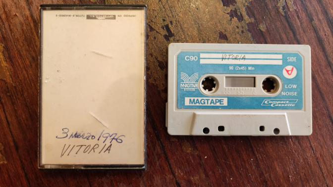 Esta cinta de casete tiene 50 años. Es una cinta que rompía la versión oficial que estaban trasladando las autoridades tras el asesinato de 5 obreros por parte de la policía el 5 de marzo de 1976 en el desalojo de una asamblea de trabajadores en la iglesia de San Francisco de Asís de Vitoria. La gente, semanas después, se la regrababa y se la pasaba. Es una especie de protopodcast, una cinta que recogía los relatos de testigos, de las grabaciones policiales, del funeral, de familiares de fallecidos, eran testimonios recogidos, dos días después, el 5 de mar...