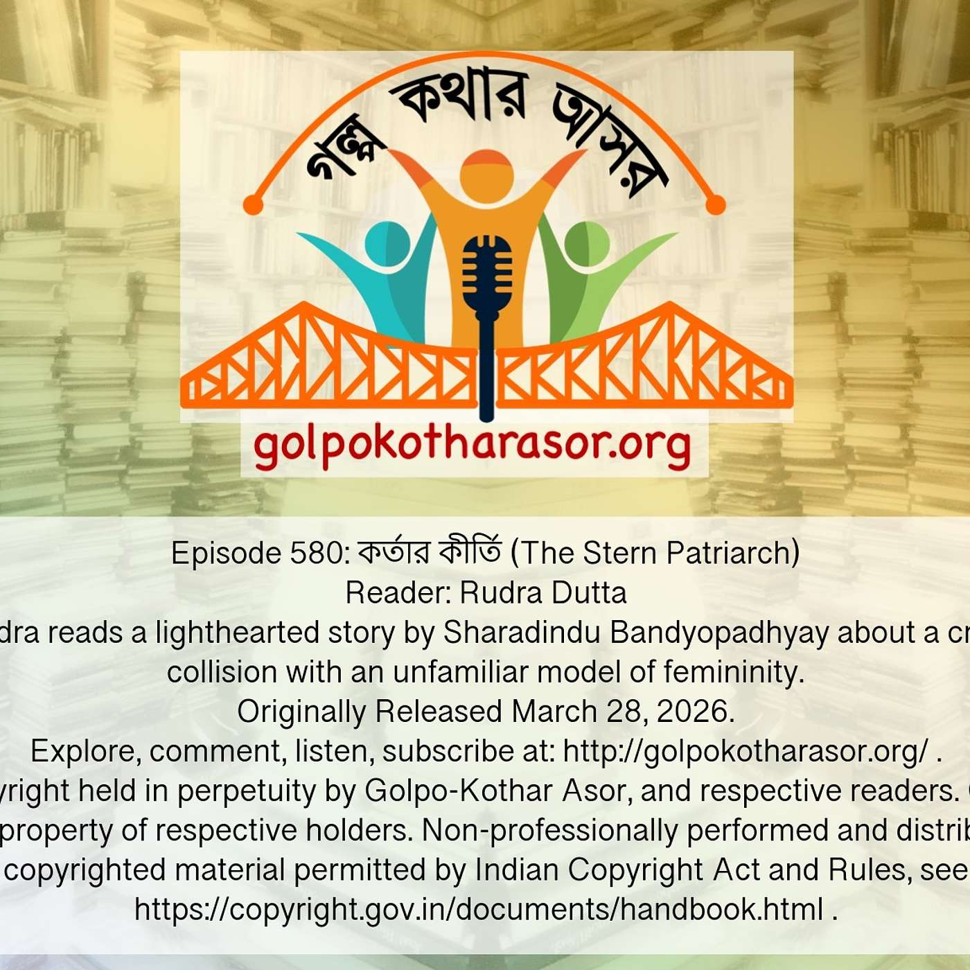 © All episodes copyright held in perpetuity by Golpo-Kothar Asor, and respective readers. Copyright of source texts remain the property of respective holders. Non-professionally performed and distributed readings of copyrighted material permitted by Indian Copyright Act and Rules...