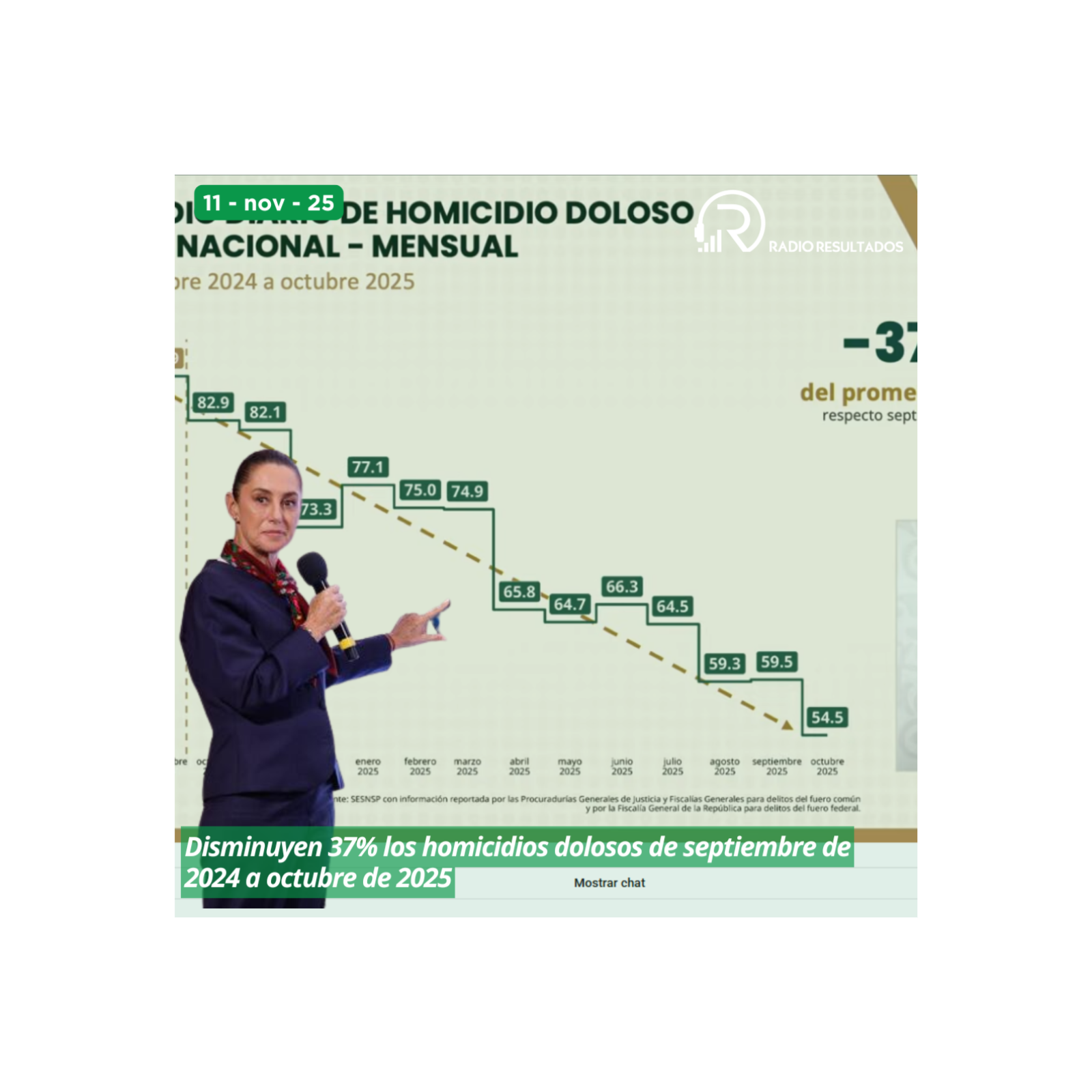 Disminuyen 37% los homicidios dolosos de septiembre de 2024 a octubre de 2025.La presidenta Sheinbaum está a favor de llevar a cabo la Revocación de Mandato el mismo día de la elección de 2027.El gobierno federal inició la segunda entrega de apoyos para la reconstrucción de viviendas y comercios afectados por las lluvias en Hidalgo, Veracruz, Puebla, Querétaro y San Luis Potosí.