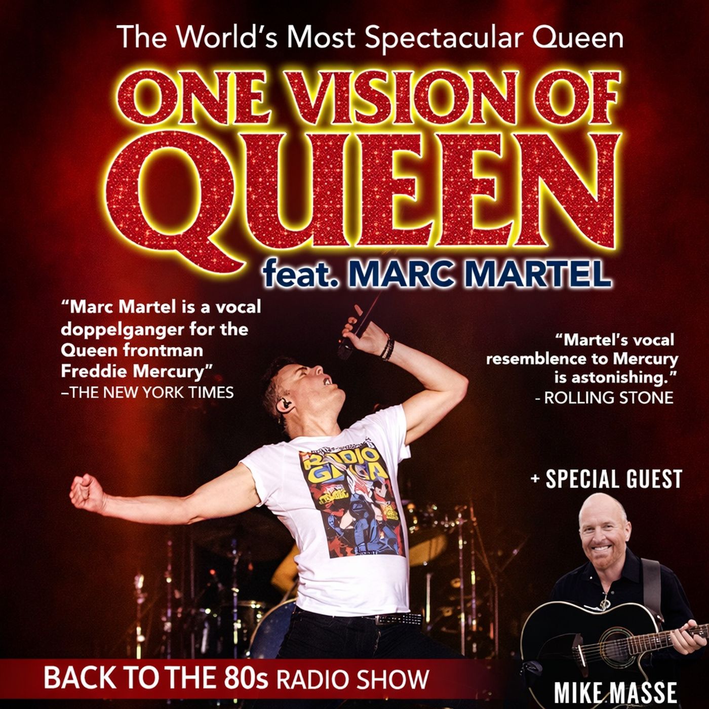 Back to the 80s Radio Presents: One Vision of Queen feat. Marc Martel – Live in Los Angeles This week on Back to the 80s Radio, we spotlight one of the most spectacular Queen tribute productions touring today — One Vision of Queen featuring Marc Martel. Marc Martel has been praised by The New York Times as a “vocal doppelganger for Queen frontman Freddie Mercury,” and Rolling Stone calls his vocal resemblance “astonishing.” If you close your eyes, you’ll swear you’re hearing Freddie himself. Experience the music that defined a generation — including: