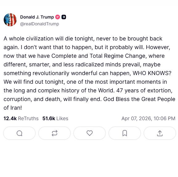 Trump threatens "a whole civilisation will die tonight" as Iran deal deadline looms