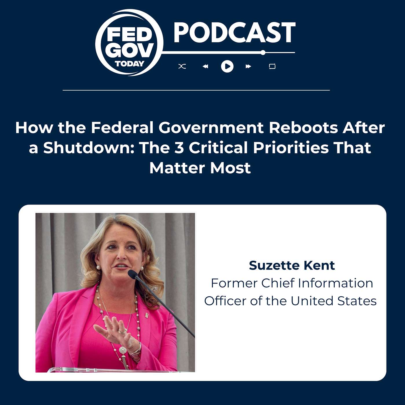In this episode of Fed Gov Today with Francis Rose, the gears of government are grinding to a halt — and the aftershocks are just beginning. As agencies brace for and recover from a federal shutdown, former Federal CIO Suzette Kent, now CEO of Kent Advisory Services, joins Francis to break down the three critical concepts every leader must master to get government back on track: people, risk, and what’s “on the clock.” Kent reveals how to prioritize the citizens and federal employees most affected, assess hidden v...