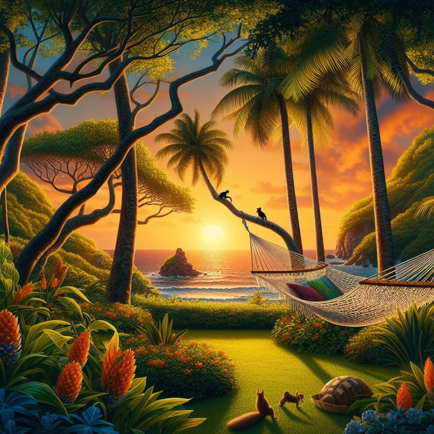 Die Geräusche der Natur umgeben dich harmonisch: Vögel singen ihre abendlichen Lieder, während Eichhörnchen fröhlich durch die Baumwipfel springen. Der Duft von Salz und frischer Luft erfüllt deine Sinne, während du den friedlichen Anblick der vorbeiziehenden Wolken genießt. In der Ferne erspähst du einen Leguan, der gemächlich über die Felsen klettert und dabei die letzten Sonnenstrahlen des Tages einfängt.
