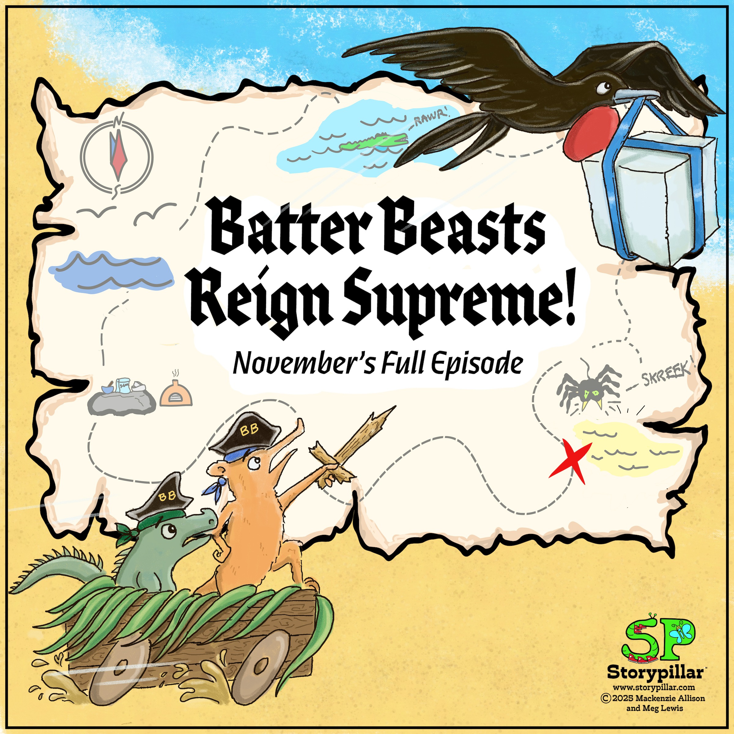 Story: Aspiring pirates, Iggy and Mango, just want to bribe a giant tarantula with cake and swim in a lake of gold. Who wouldn’t!? But will a feathery intruder with a supremely high opinion of himself squash their plans like a moldy papaya??? Only time (and listening to this episode) will tell…