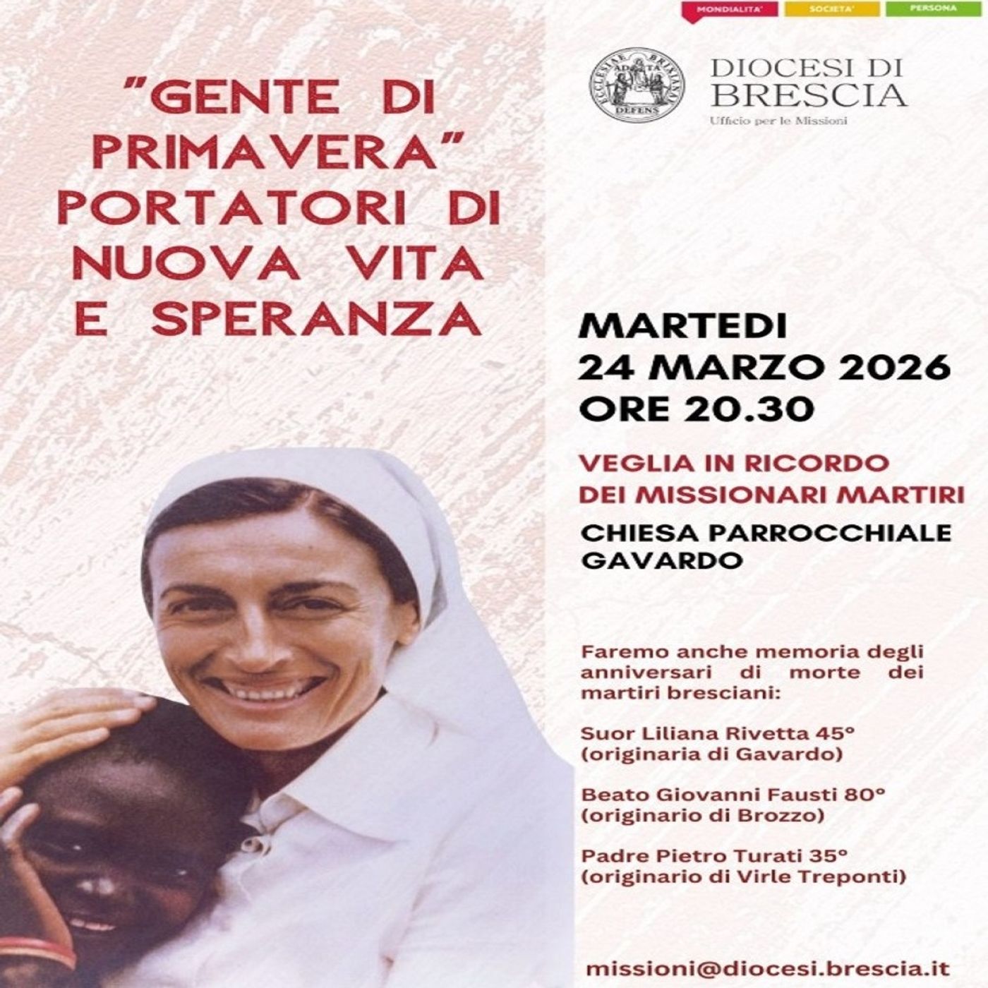 “Gente di primavera” - Portatori di nuova vita e speranza. Martedì 24 marzo celebriamo la 34esima Giornata dei Missionari Martiri. Alle ore 20.30, presso la chiesa parrocchiale di Gavardo, si svolgerà una Veglia di preghiera in ricordo di tutti i missionari martiri, in particolare di tre martiri bresciani. Abbiamo raggiunto al telefono Andrea Burato, vicedirettore dell'Ufficio per le Missioni.