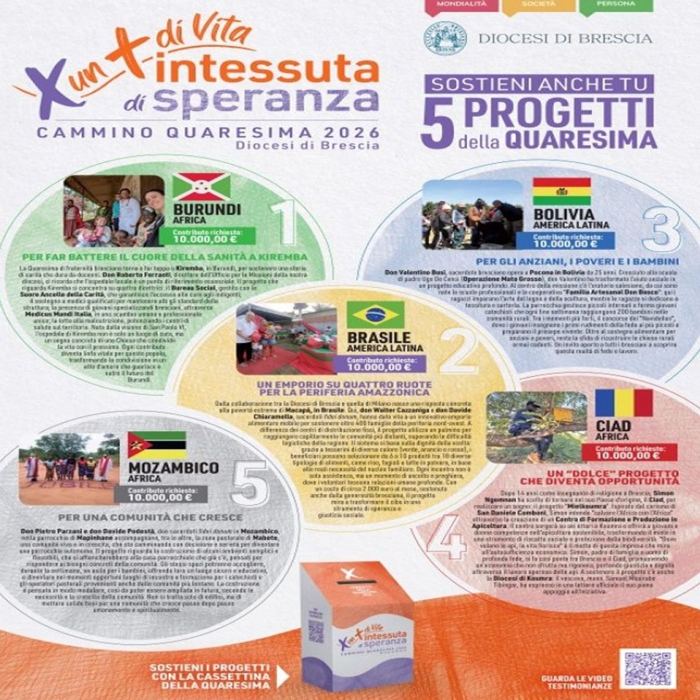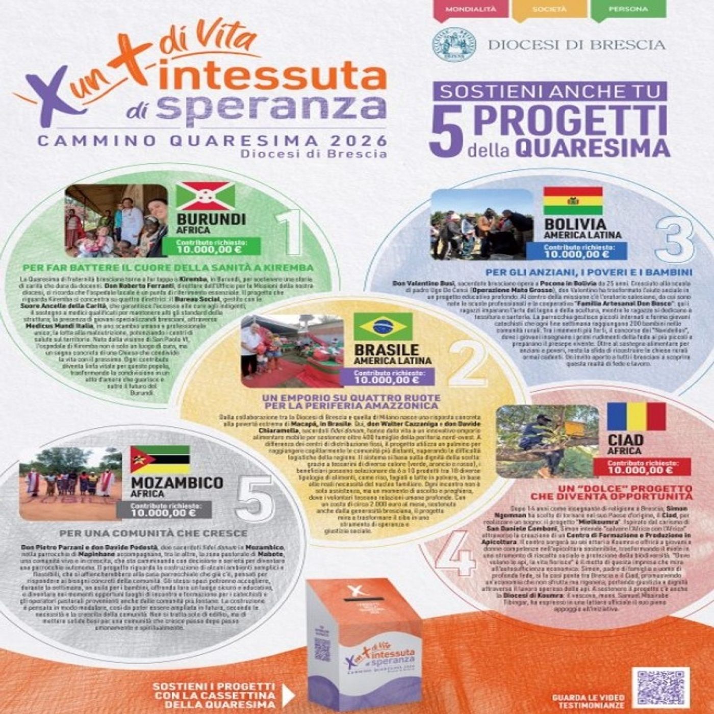 Cammino di Quaresima 2026: Per un + di Vita intessuta di speranza. Anche quest’anno la Diocesi di Brescia ci invita a conoscere e ad aiutare cinque progetti missionari, dal Sudamerica all’Africa, per tessere insieme un filo di speranza oltre ogni confine.