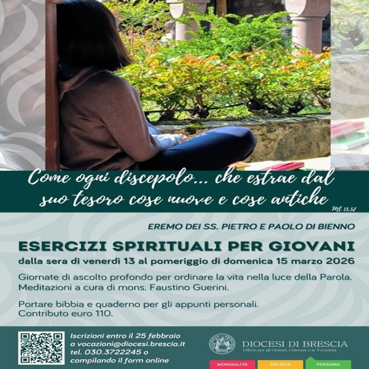 Dalla sera di venerdì 13 marzo al pomeriggio di domenica 15 marzo, presso l’Eremo dei Santi Pietro e Paolo di Bienno, si terranno gli Esercizi Spirituali per Giovani. Abbiamo parlato con Mons. Faustino Guerini, Vicario per la Pastorale e i Laici, che predicherà gli Esercizi.