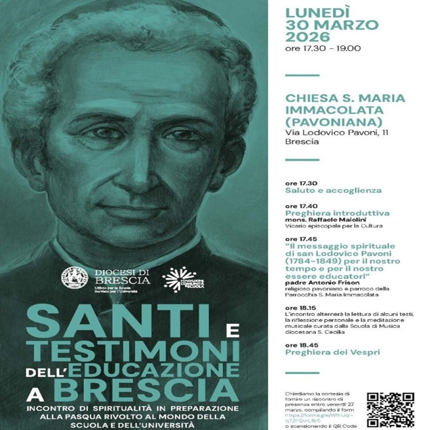Santi e testimoni dell'educazione a Brescia. Lunedì 30 marzo dalle ore 17.30 alle ore 19.00, Presso la chiesa di Santa Maria Immacolata (Pavoniana), si terrà un incontro di spiritualità in preparazione alla Pasqua, rivolto al mondo della scuola e dell’università . L'intervista a Davide Guarneri, respondabile per la scuola presso l'Ufficio Scuola della Diocesi.