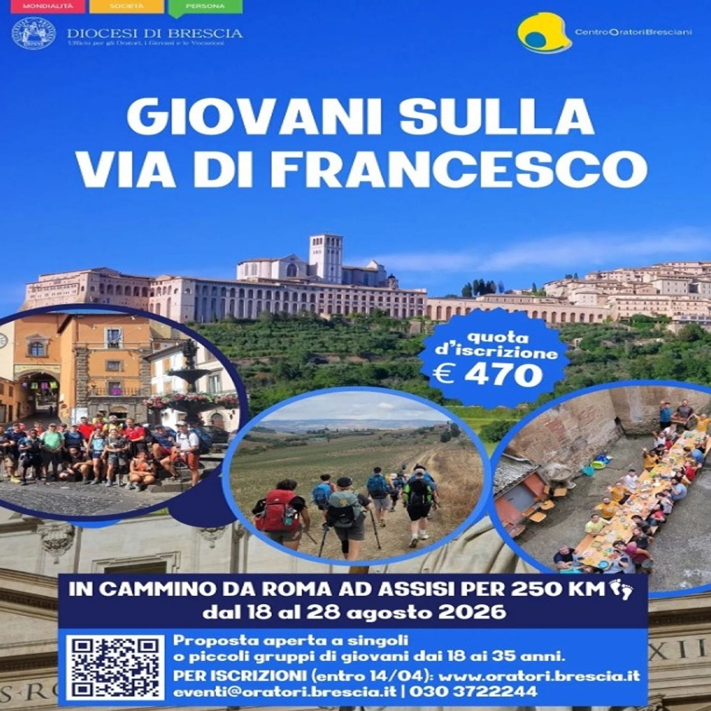 Giovani sulla Via di Francesco. Per la seconda metĂ di agosto la Diocesi di Brescia organizza un pellegrinaggio a piedi per giovani dai 18 ai 35 anni, da Roma ad Assisi: 250 chilometri suddivisi in 10 giorni, per camminare insieme sui passi di San Francesco. Le iscrizioni sono aperte fino al 14 aprile. Abbiamo parlato con Luca Minelli, del Centro Oratori Bresciani