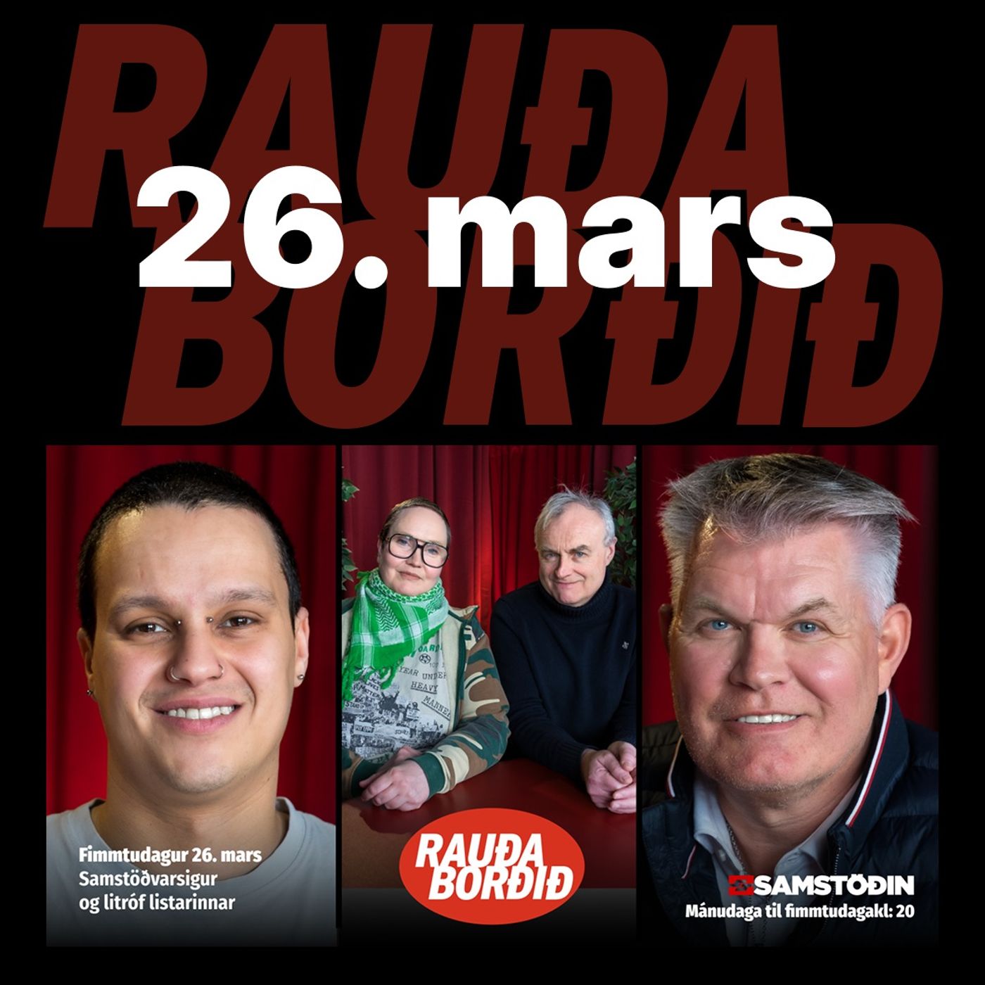 Fimmtudagur 26. mars Samstöðvarsigur og litróf listarinnar Þátturinn er stuttur í kvöld, en veðurofsi fyrri part dags setti dagskrána aðeins úr skorðum, svo í þessum síðasta þætti Rauða borðsins fyrir Páska bjóðum við upp á tvö viðtöl við tvo góða gesti. Fyrst fær Björn Þorláks til sín góðvin Rauða borðsins, Gísla Tryggvason. Innslagið Réttur er settur, sem þeir félagar hafa haldið úti í vetur fjallar í þetta sinn um sigur Samstöðvarinnar í meiðyrðamáli sem Gísli rak fyrir dómi nýlega fyrir hönd miðilsins. Sýningin „Þegar ég sé þ...