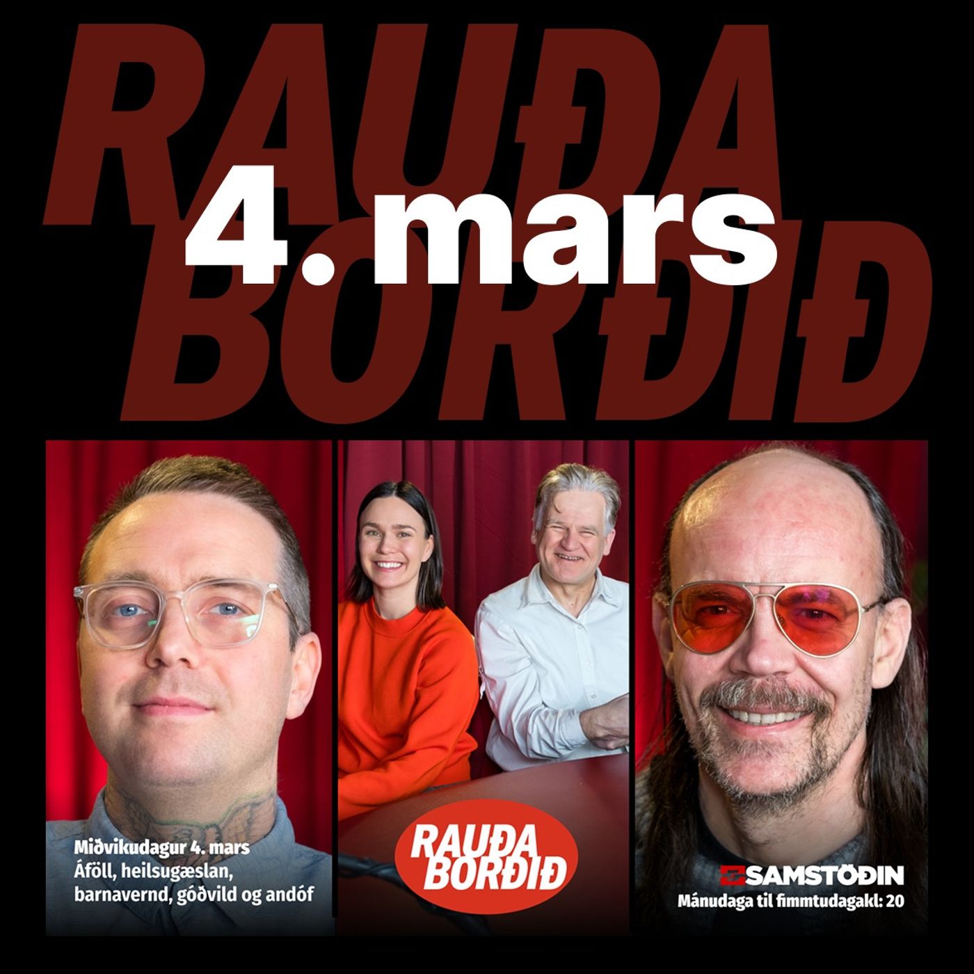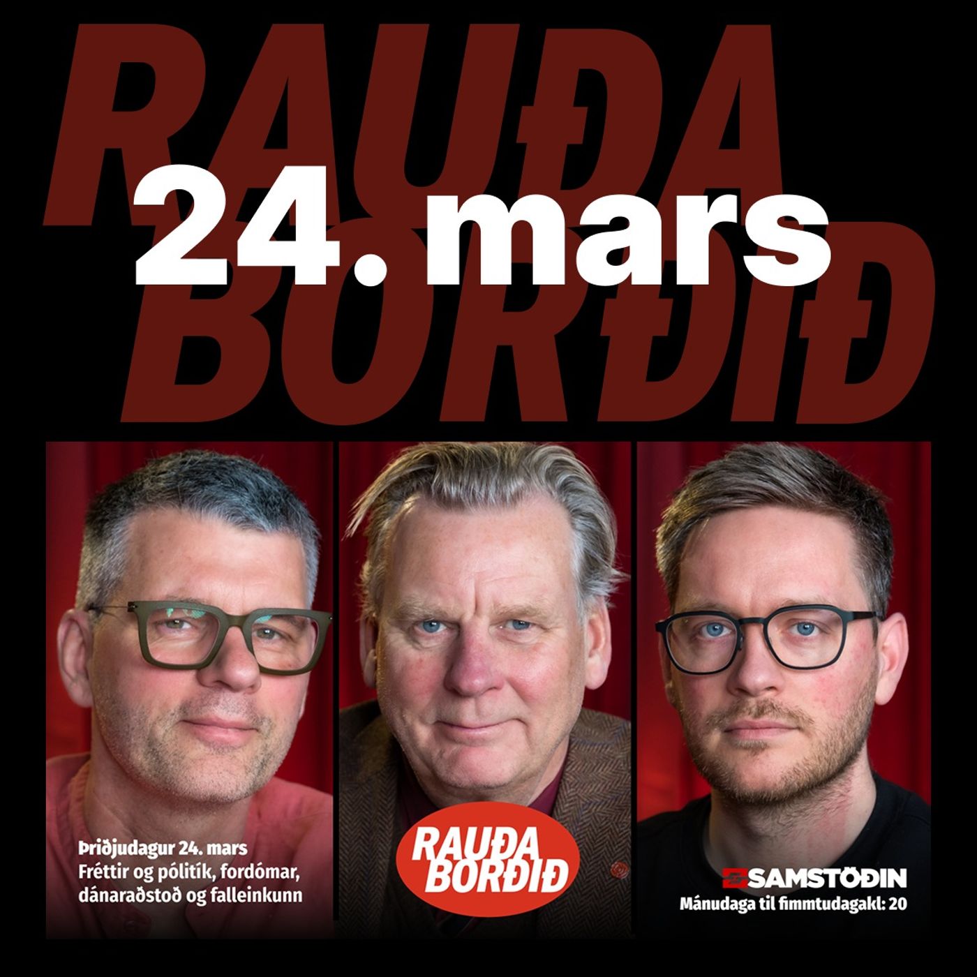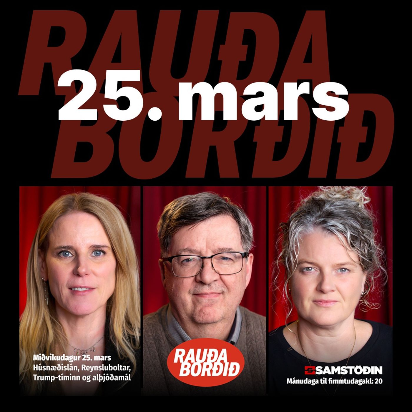 Miðvikudagur 18. mars Spilling, Trump, Reynsluboltar og leiklist Útboðsspilling, einkum tengd verkfræðistofum, er fyrsta umræðuefni Rauða borðsins í kvöld í samtali Björgvins Víglundssonar byggingarverkfræðings við Björn Þorláksson. Dæmi eru um að hið opinbera greiði meira en tuttugufaldan verkkostnað vegna tengsla. Finnur Dellsén heimspekingur, Sveinn Máni Jóhannesson sagnfræðingur og Þorsteinn Þorgeirsson hagfræðingur ræða við Gunnar Smára um Donald Trump og áhrif hans á heiminn og hugmyndir okkar. Oddný G. Harðardóttir, fyrrum þingkona og ráðherra, Jón Trausti Reynisson blaðamaður og Lárus Guðmundsson miðflokksmaður ræða fréttir...