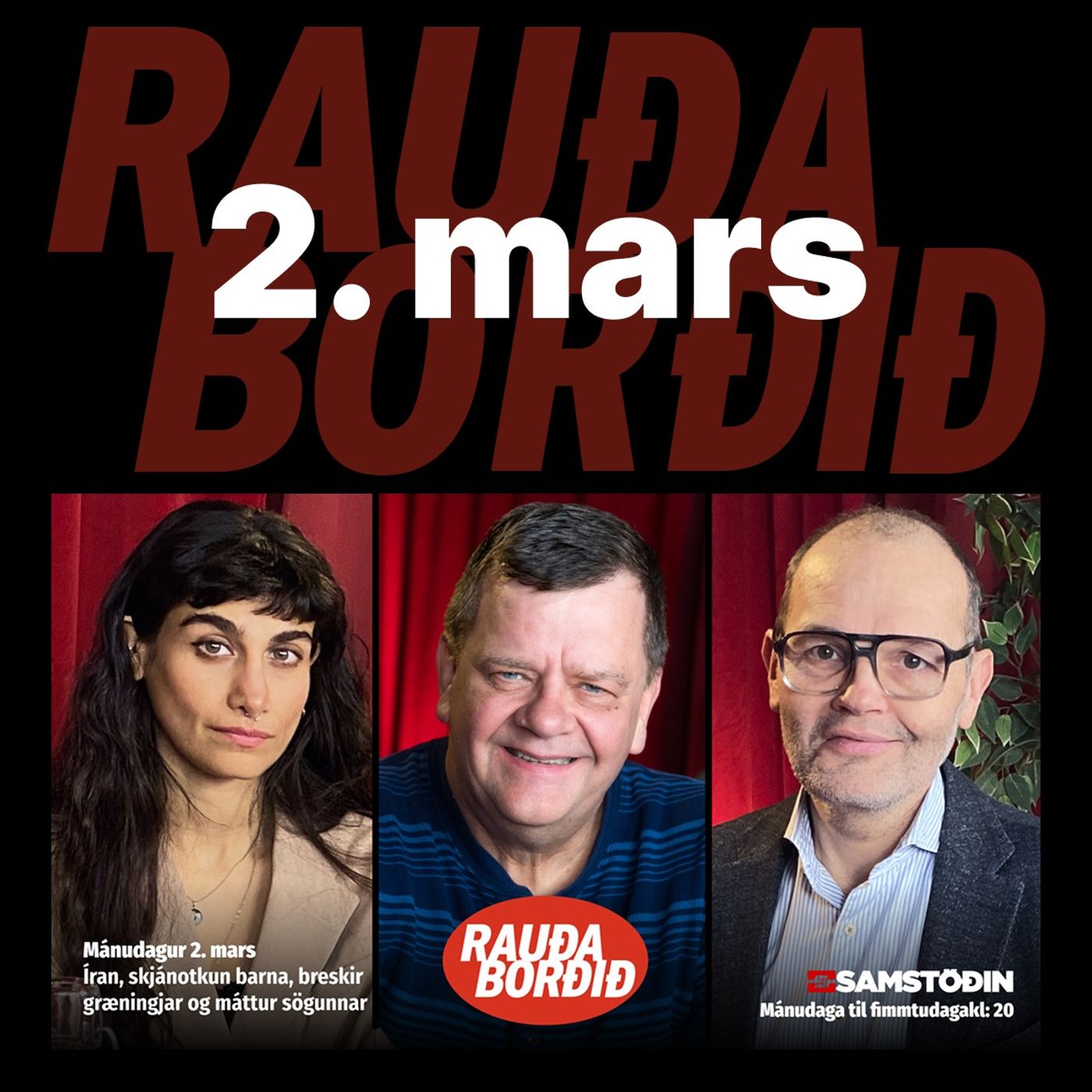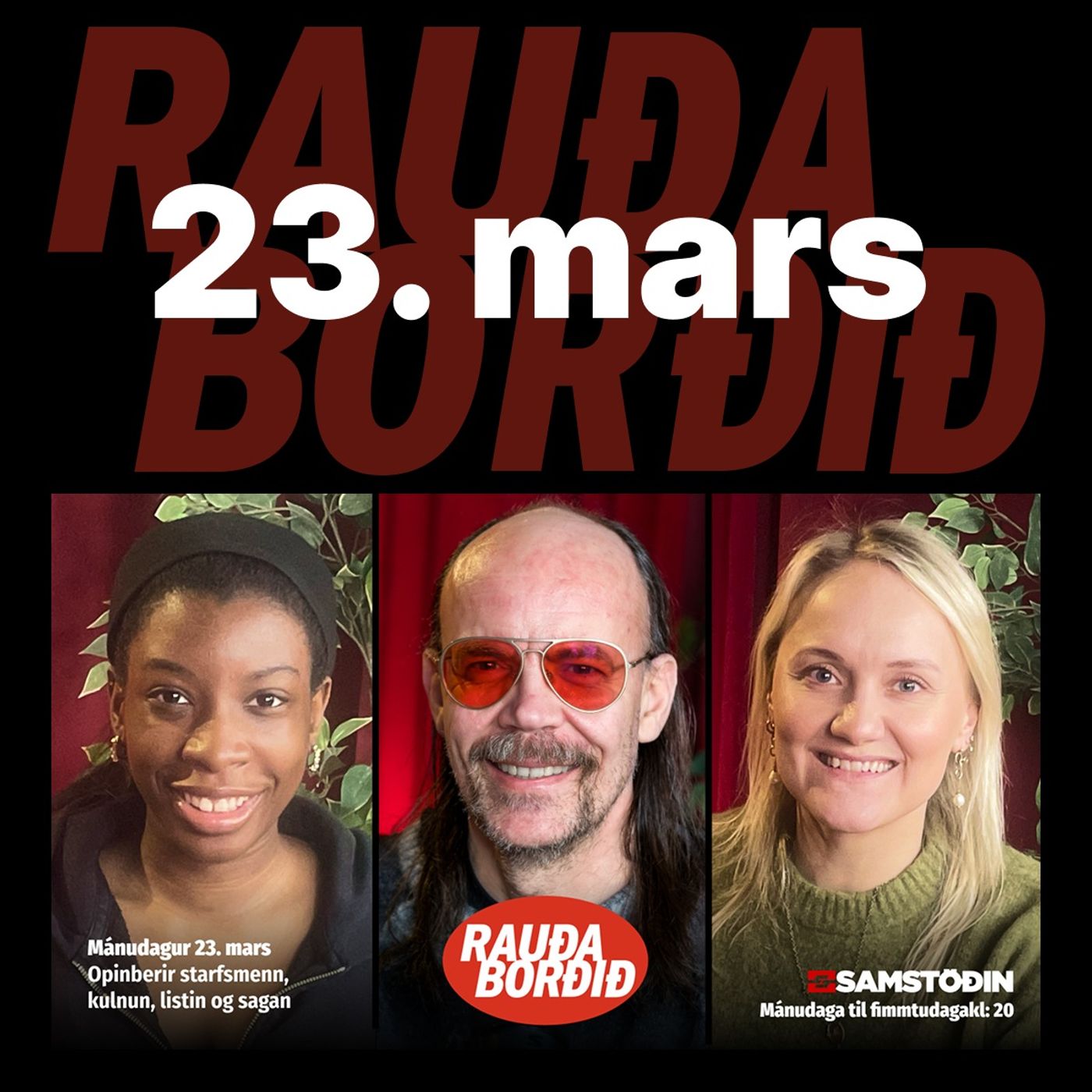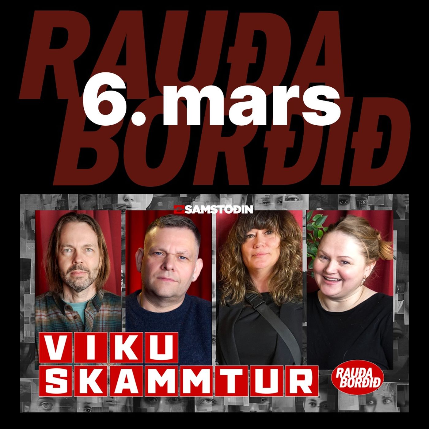 Föstudagur 20. mars Vikuskammtur: Vika 12 Gestir mæta við Rauða borðið til að ræða fréttir vikunnar sem að þessu sinni einkenndust af meiri stríðum, meiri öfgum, meiri átökum og hærra vaxtastigi, en einnig af tónlist, sveitarstjórnarkosningum og ýmsu öðru. Þau Arna Magnea Danks, leikkona og kennari, Jasmina Vajzovic, ráðgjafi, Bjarki Hjörleifsson, Varaformaður VG og Bogi Reynisson, hljóðmaður tækla þessi umræðuefni með Laufeyju Líndal.