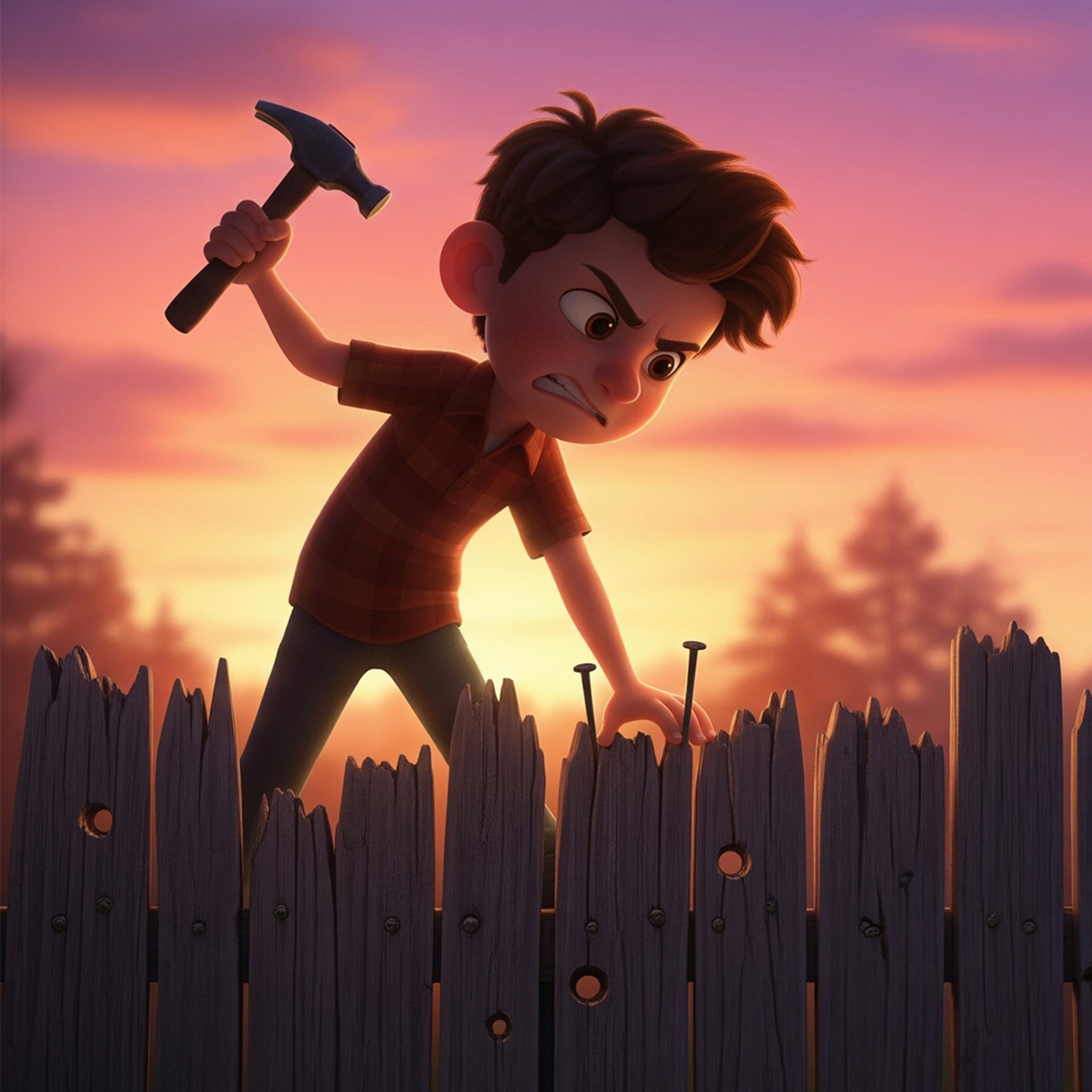 En rørende godnathistorie om en dreng med et hedt temperament, der lærer en livsvigtig lektie om ord og venlighed. Med hjælp fra sin far, en pose søm og et gammelt hegn opdager drengen, at ord kan efterlade ar – ligesom søm i træ. Perfekt til børn fra 4–9 år, der elsker historier med en god morale.