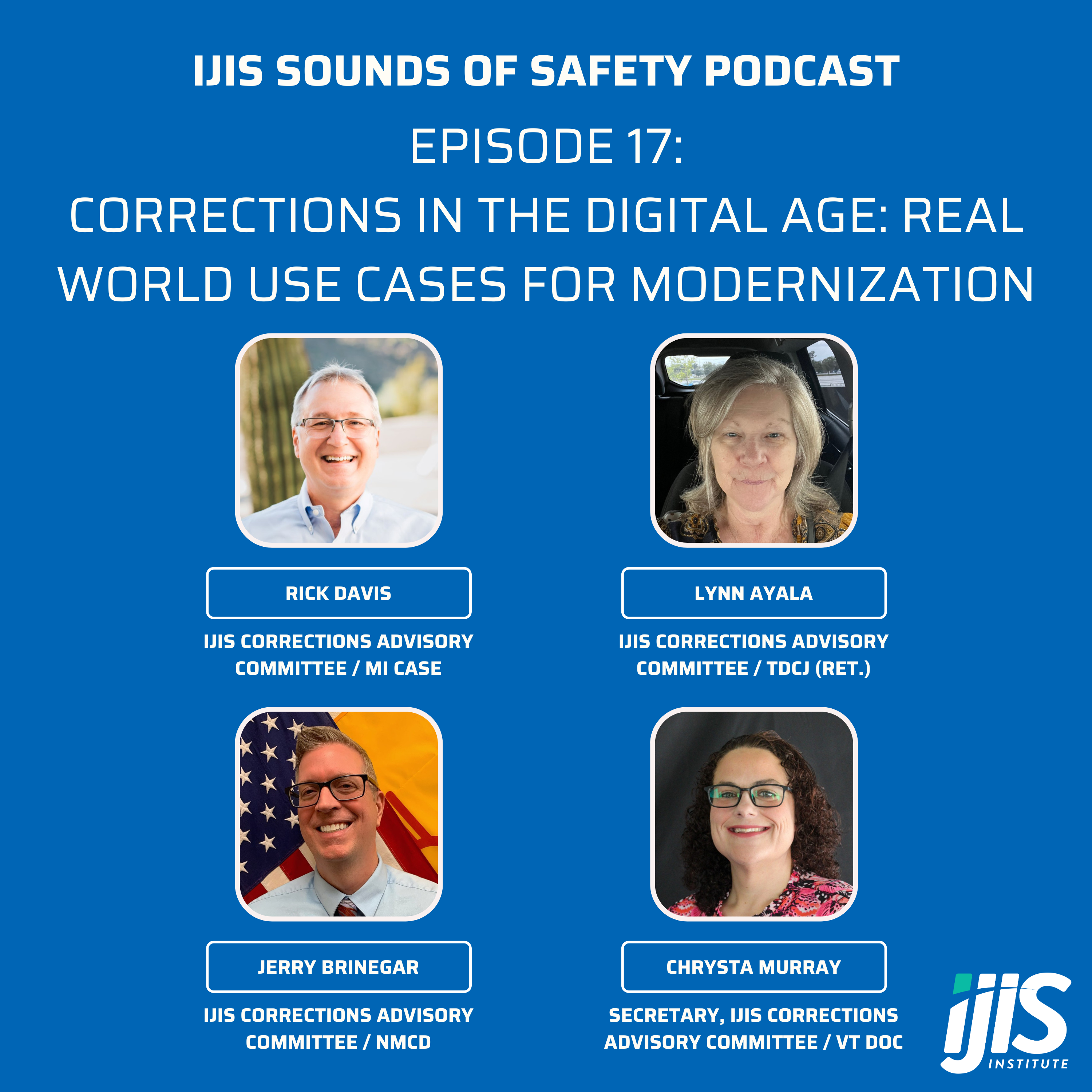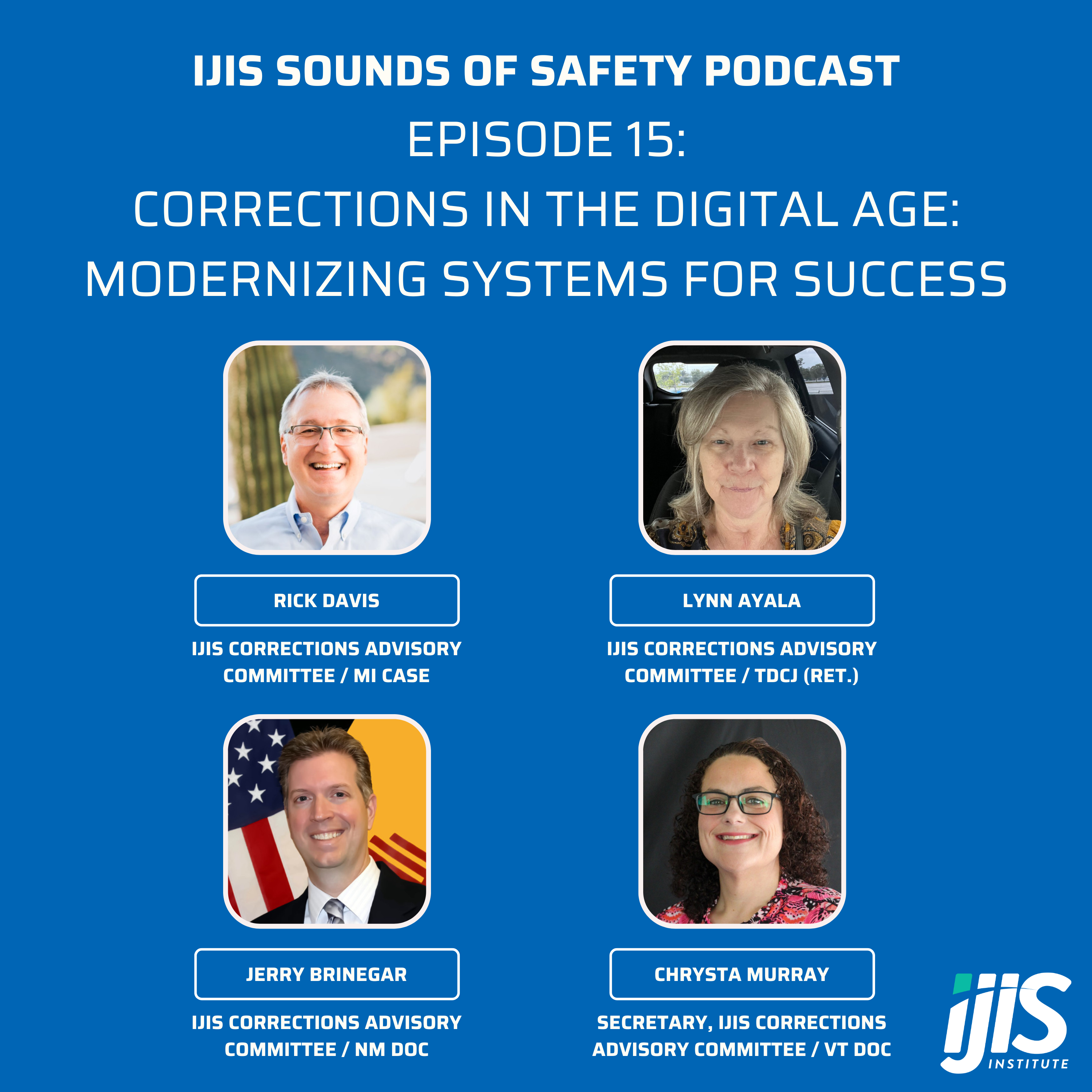 In this episode, we continue our series on best practices for implementing offender and jail management systems within corrections agencies. We're excited to welcome back esteemed members of the IJIS Corrections Advisory Committee—Rick Davis, Lynn Ayala, Jerry Brinegar, and Chrysta Murray—who bring a wealth of practical experience and insights to the conversation. Together, they explore the challenges and opportunities of system modernization, sharing real-world use cases that highlight the importance of updating legacy technologies. Their firsthand perspectives offer valuable guidance for agencies navigating the complexities of digital transformation.