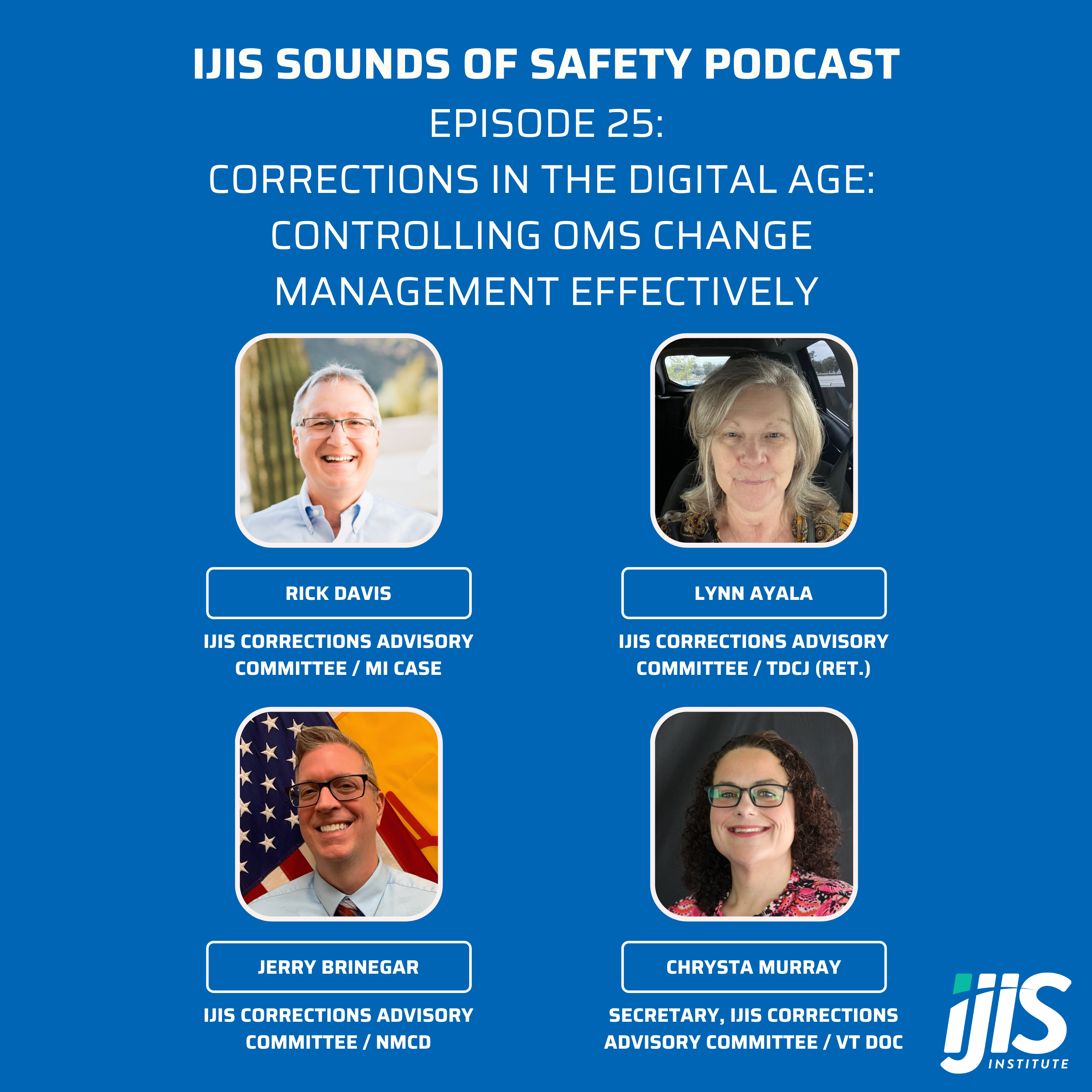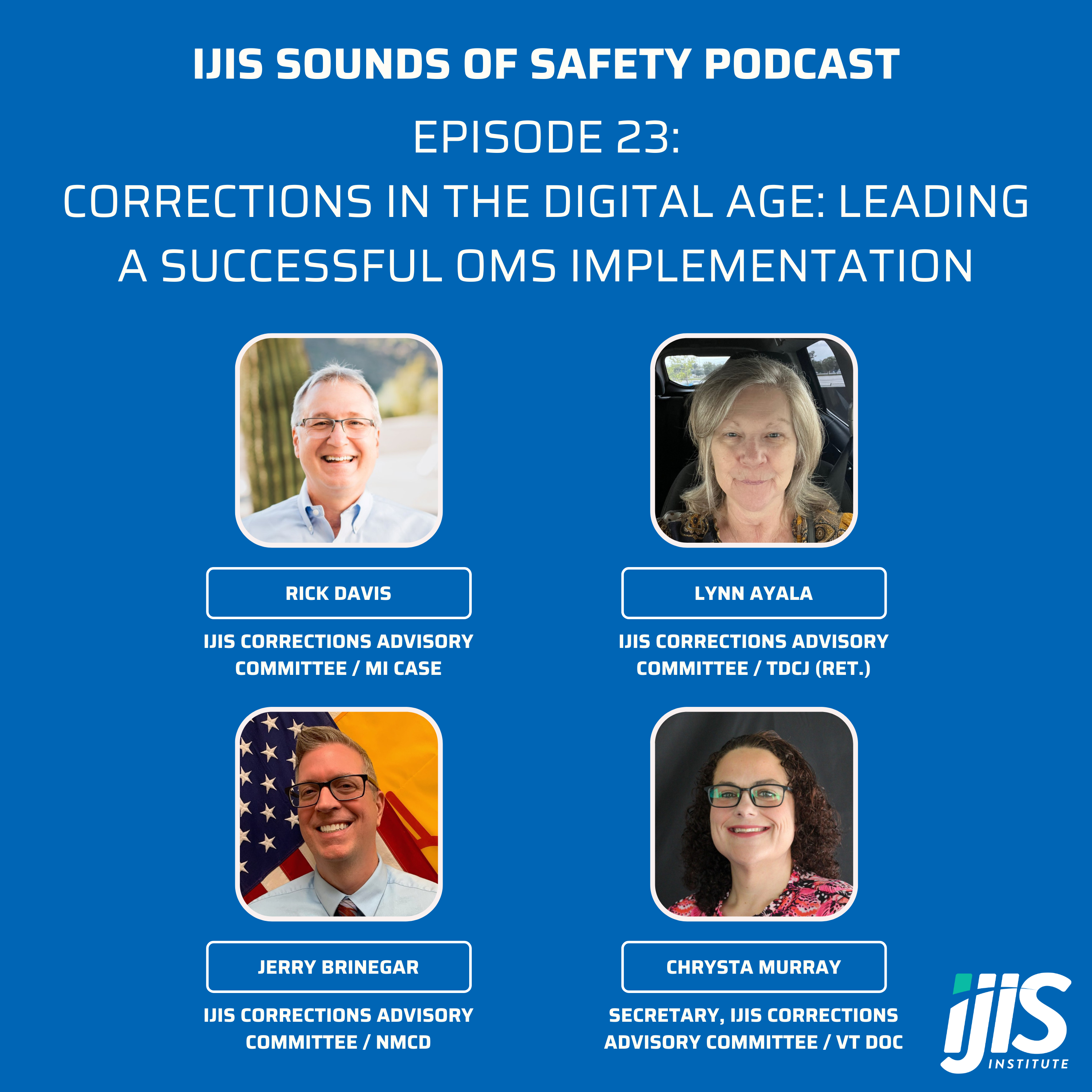 In this episode, we continue our ongoing series on best practices for implementing offender and jail management systems in corrections agencies. We’re joined once again by four distinguished voices from the IJIS Corrections Advisory Committee—Rick Davis, Lynn Ayala, Jerry Brinegar, and Chrysta Murray. Their years of expertise and hands-on experience make them invaluable guides in this evolving space. Together, they’ll dive into the newly updated IJIS publication entitled “Functional Specifications for Correctional Management Systems,” and help unpack the key features and capabilities that define today’s most effective solutions.