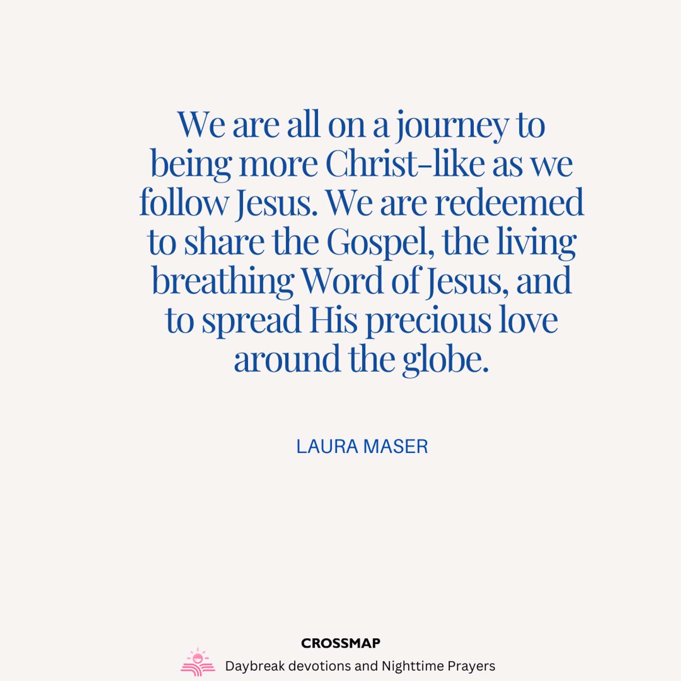 We are all on a journey to being more Christ-like as we follow Jesus. We are redeemed to share the Gospel, the living breathing Word of Jesus, and to spread His precious love around the globe.