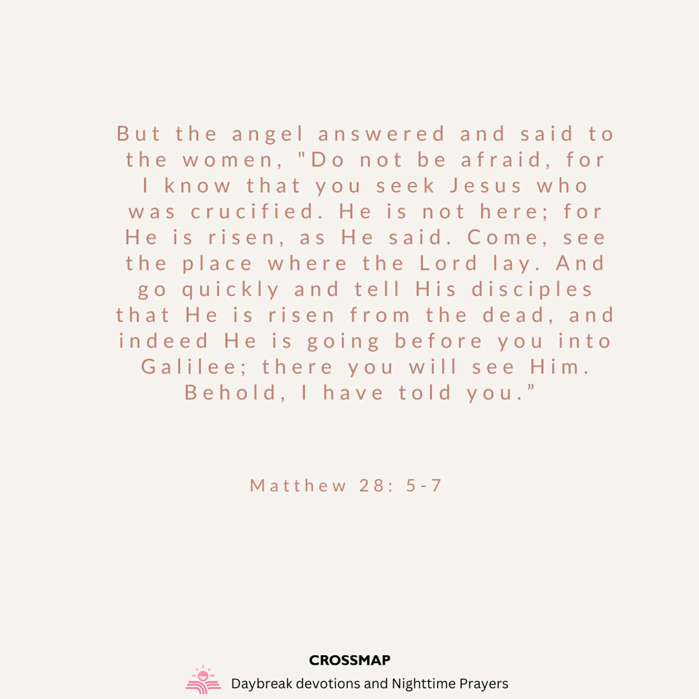 But the angel answered and said to the women, "Do not be afraid, for I know that you seek Jesus who was crucified. He is not here; for He is risen, as He said. Come, see the place where the Lord lay. And go quickly and tell His disciples that He is risen from the dead, and indeed He is going before you into Galilee; there you will see Him. Behold, I have told you." -- Matthew 28: 5-7