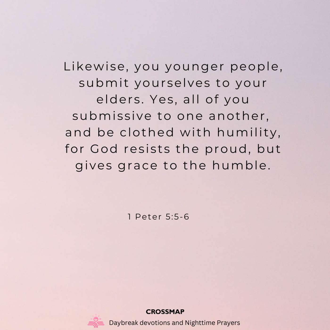 Likewise, you younger people, submit yourselves to your elders. Yes, all of you submissive to one another, and be clothed with humility, for “God resists the proud, but gives grace to the humble.” -- 1 Peter 5:5-6