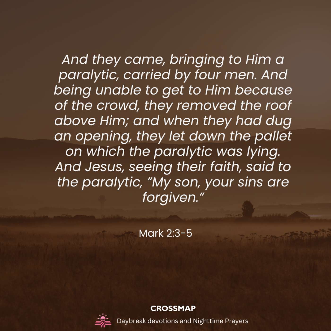 And they came, bringing to Him a paralytic, carried by four men. And being unable to get to Him because of the crowd, they removed the roof above Him; and when they had dug an opening, they let down the pallet on which the paralytic was lying. And Jesus, seeing their faith, said to the paralytic, “My son, your sins are forgiven.” – Mark 2:3-5
