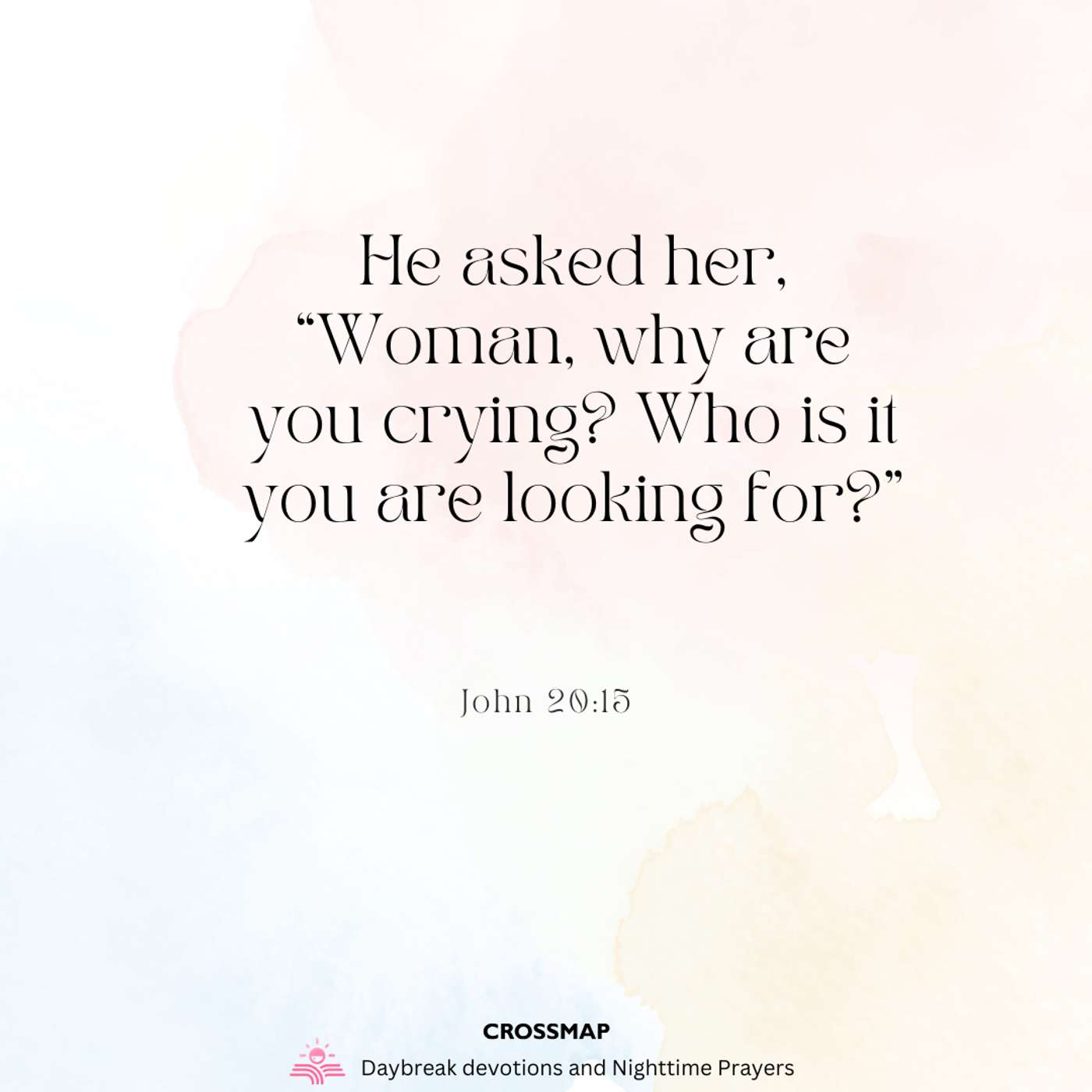They asked her, “Woman, why are you crying?” “They have taken my Lord away,” she said, “and I don’t know where they have put him.” At this, she turned around and saw Jesus standing there, but she did not realize that it was Jesus. He asked her, “Woman, why are you crying? Who is it you are looking for?” Thinking he was the gardener, she said, “Sir, if you have carried him away, tell me where you have put him, and I will get him.” Jesus said to her, “Mary.” She turned toward him and cried out in Aramaic, “Rabboni!” (which me...