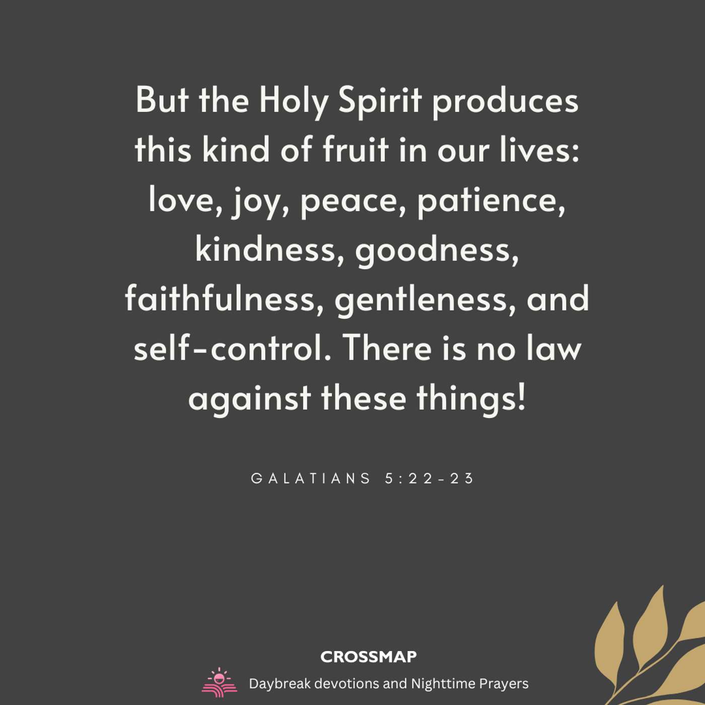 But the Holy Spirit produces this kind of fruit in our lives: love, joy, peace, patience, kindness, goodness, faithfulness, gentleness, and self-control. There is no law against these things! -- Galatians 5:22-23