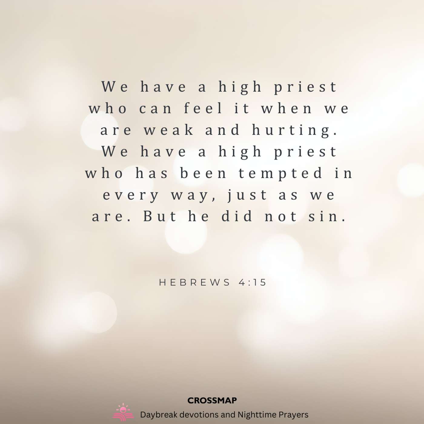 “We have a high priest who can feel it when we are weak and hurting. We have a high priest who has been tempted in every way, just as we are. But he did not sin.” -- Hebrews 4:15