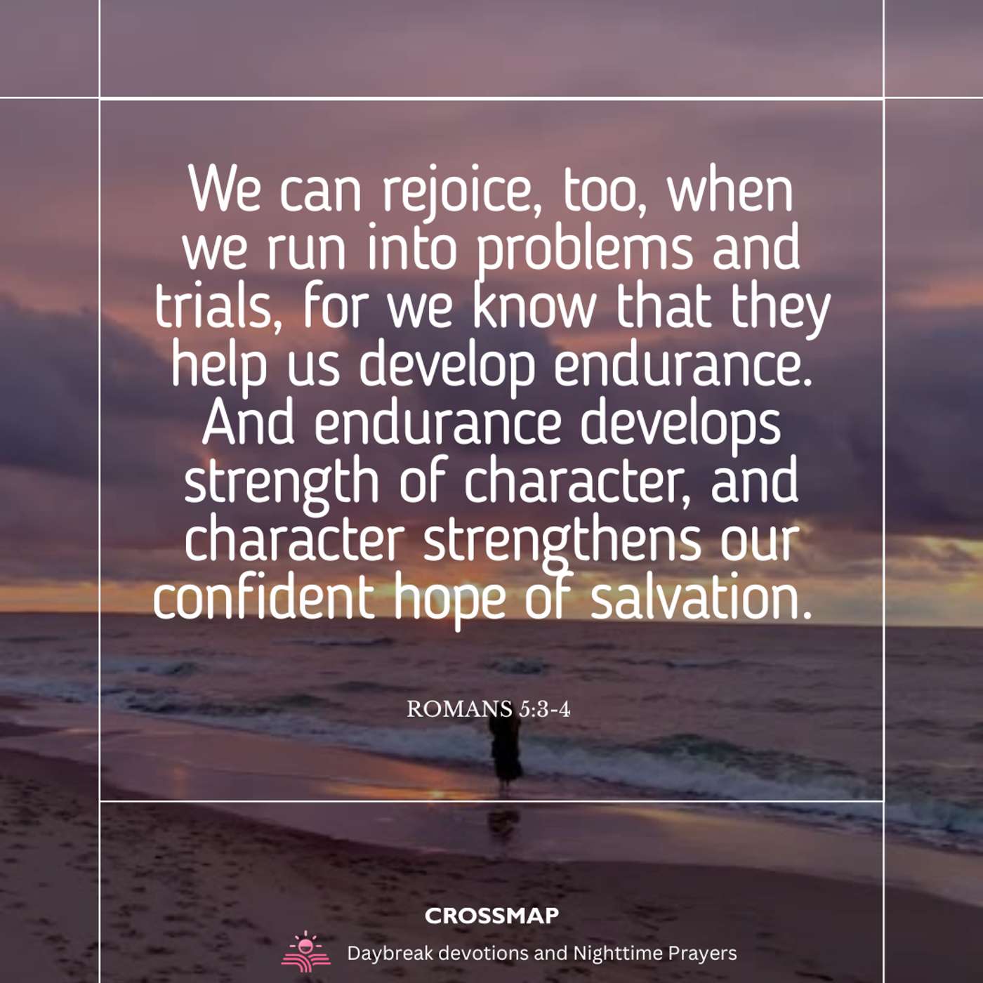 We can rejoice, too, when we run into problems and trials, for we know that they help us develop endurance. And endurance develops strength of character, and character strengthens our confident hope of salvation. – Romans 5:3-4