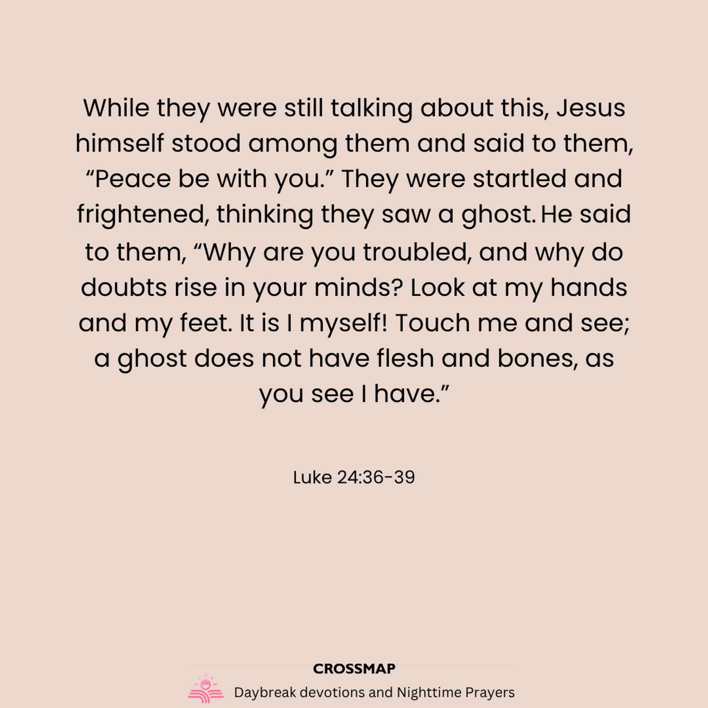 “Then the two from Emmaus told their story of how Jesus had appeared to them as they were walking along the road, and how they had recognized him as he was breaking the bread. And just as they were telling about it, Jesus himself was suddenly standing there among them. ‘Peace be with you,’ he said. But the whole group was startled and frightened, thinking they were seeing a ghost! ‘Why are you frightened?’ he asked. ‘Why are your hearts filled with doubt? Look at my hands. Look at my feet. You can see that it’s really me. Touch me and m...