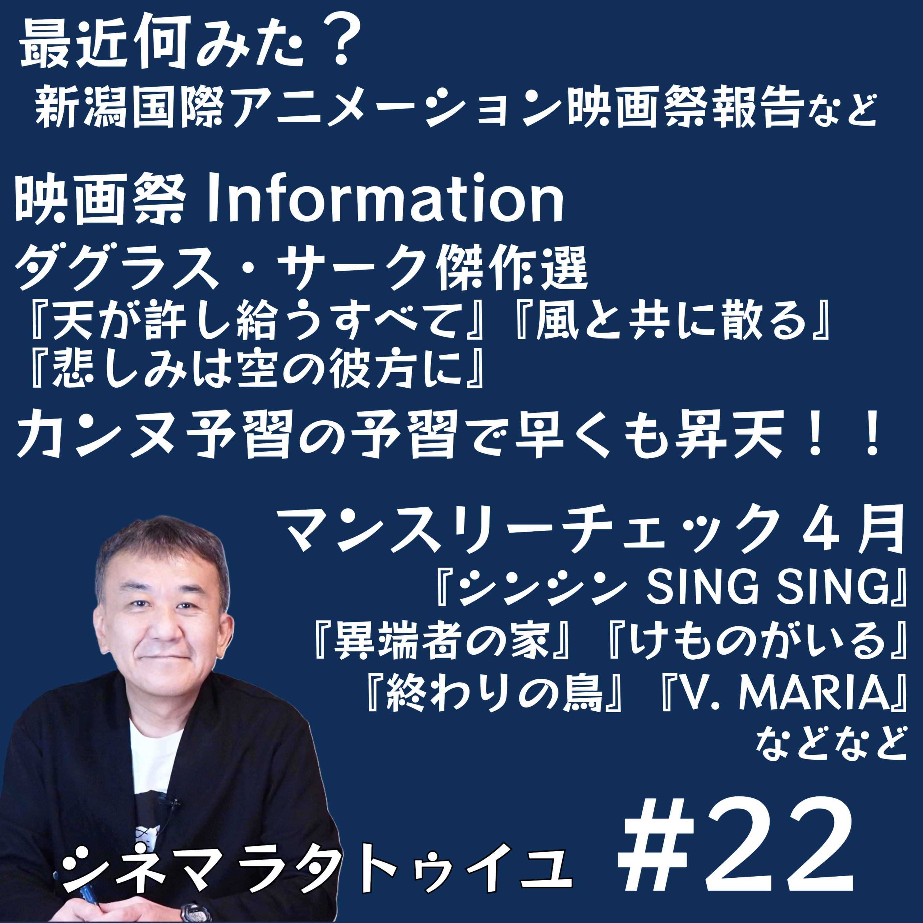 新潟アニメ映画祭報告、カンヌ入り作品予想、「黄金期のダグラス・サーク特集」紹介、4月公開作品チェックとして『V Maria』『終わりの鳥』『シンシン Sing Sing』『異端者の家』『けものがいる』について語っています。おたよりはこちらまで!https://forms.gle/AixjXzRRYNSYPW5N8
