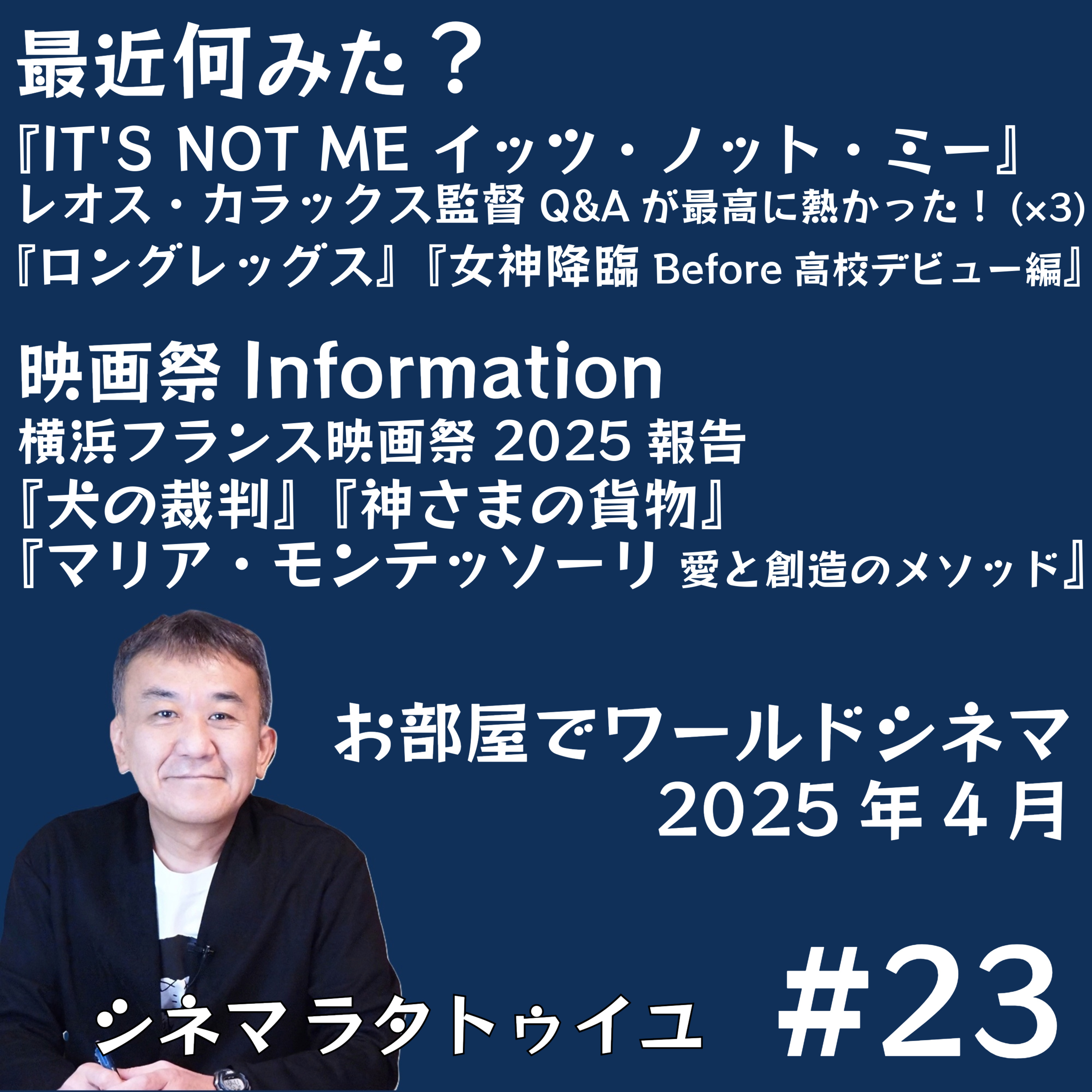 『イッツ・ノット・ミー』とレオス・カラックスQA裏話、『女神降臨 before 高校デビュー編』、フランス映画祭報告、ミシェル・アザナヴィシウスとジャン=ルイ・トランティニャン、4月配信入り作品について。お便りお待ちしております!こちらから: