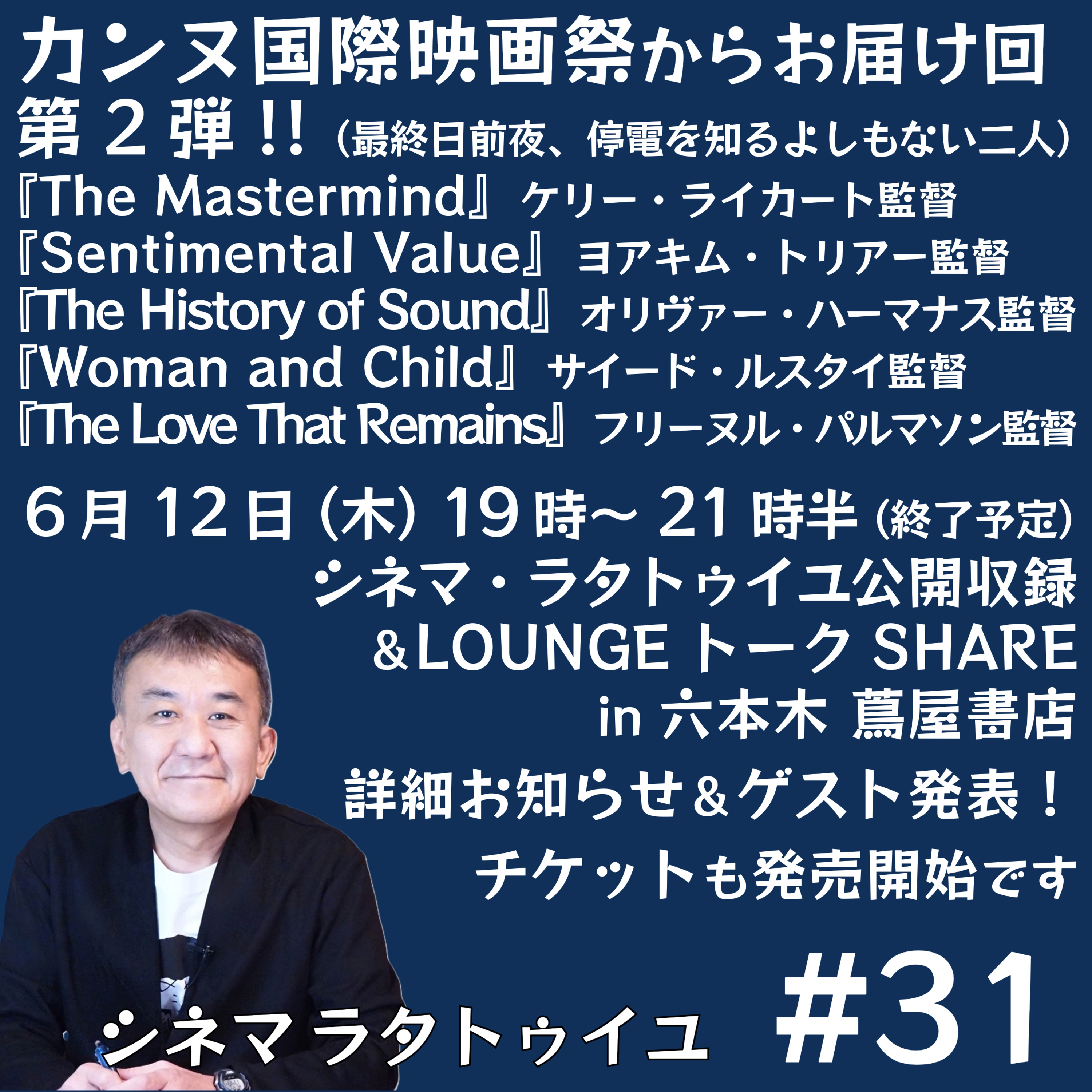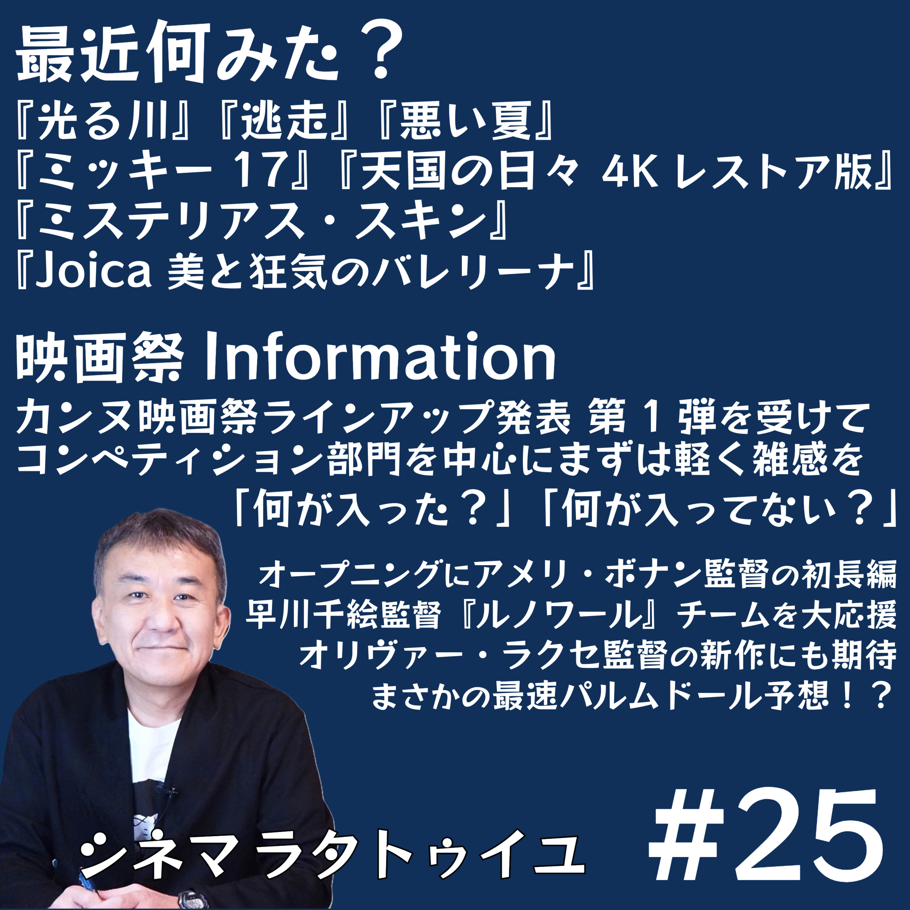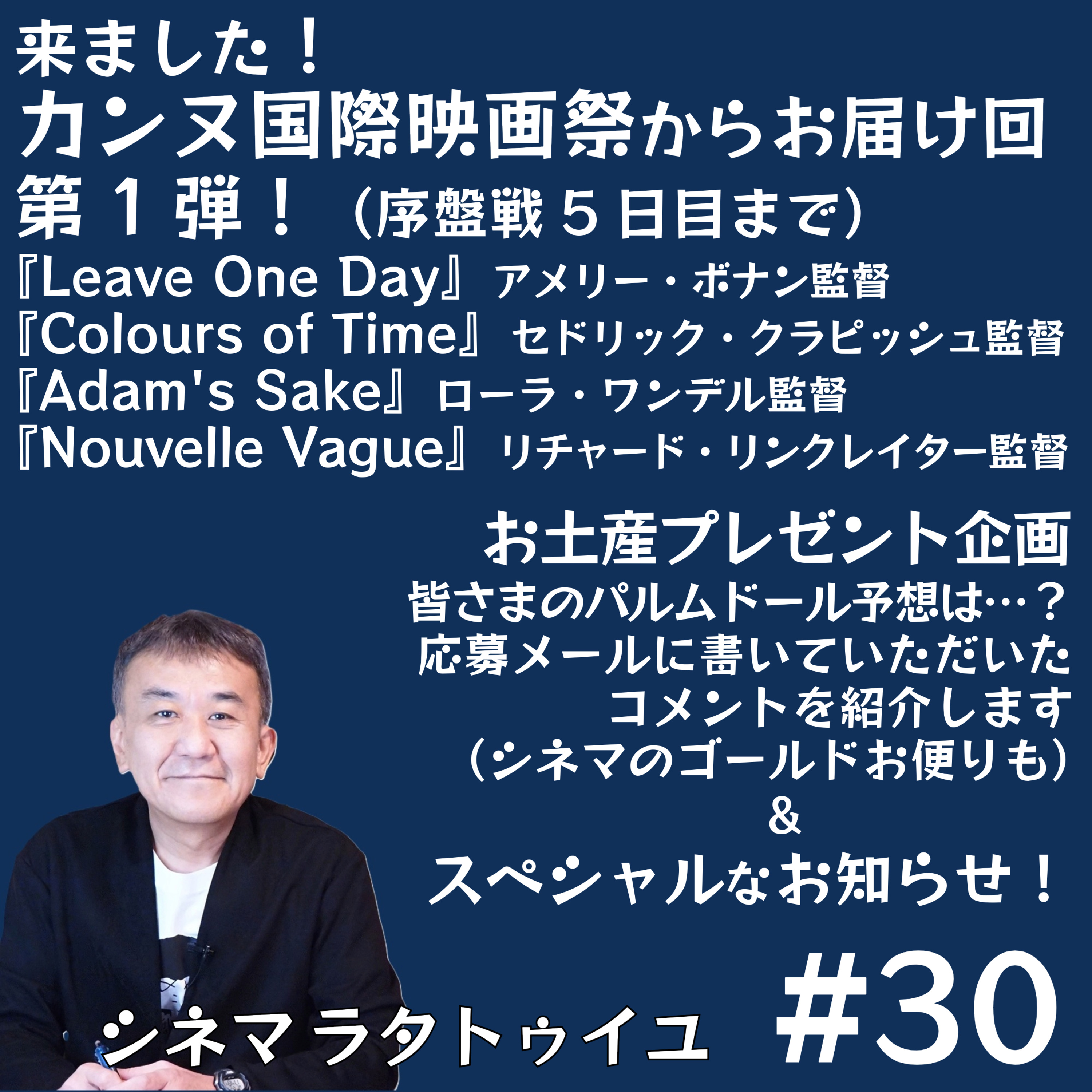 「初デート映画」と「シネマのゴールド」の傑作メール紹介に続き、カンヌ受賞予想の素晴らしいメールの数々をご紹介。そしていよいよカンヌ映画祭の現地から序盤戦の模様をレポートします!カンヌの雰囲気をお伝えし、映画祭オープニング作品や「批評家週間」オープニング作品、さらにコンペの数作品について最速コメントをお届けします。メールはこちらから!https://forms.gle/AixjXzRRYNSYPW5N8