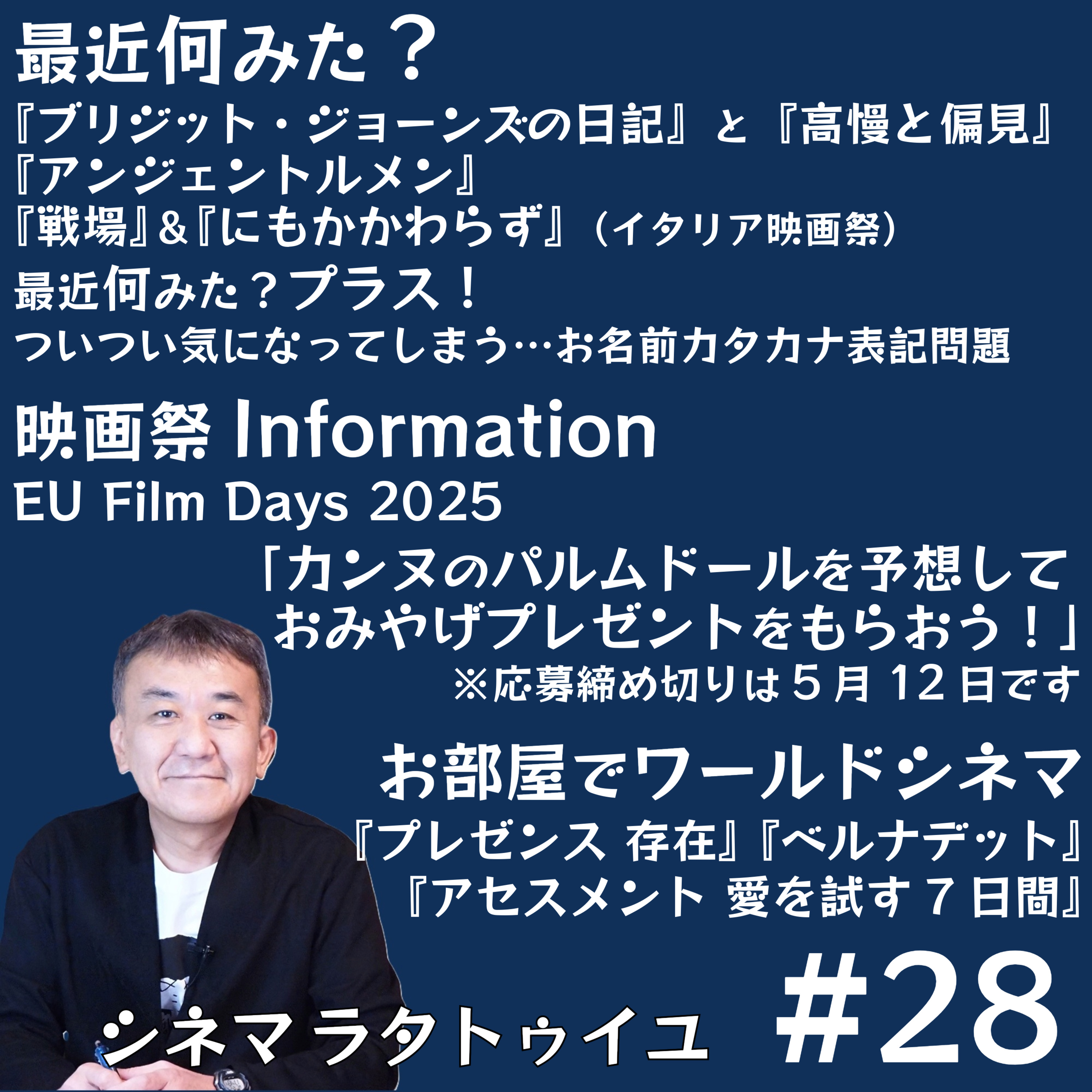 ブリジット・ジョーンズとジェーン・オースティンの世界、『アンジェントルメン』、イタリア映画祭『戦場』『にもかかわらず』等を語り、カンヌの注目作を追加でチェックし、新たに配信入りする話題作を確認する中で『アセスメント~愛を試す7日間』を紹介。メールはこちらからお願いします!https://forms.gle/AixjXzRRYNSYPW5N8