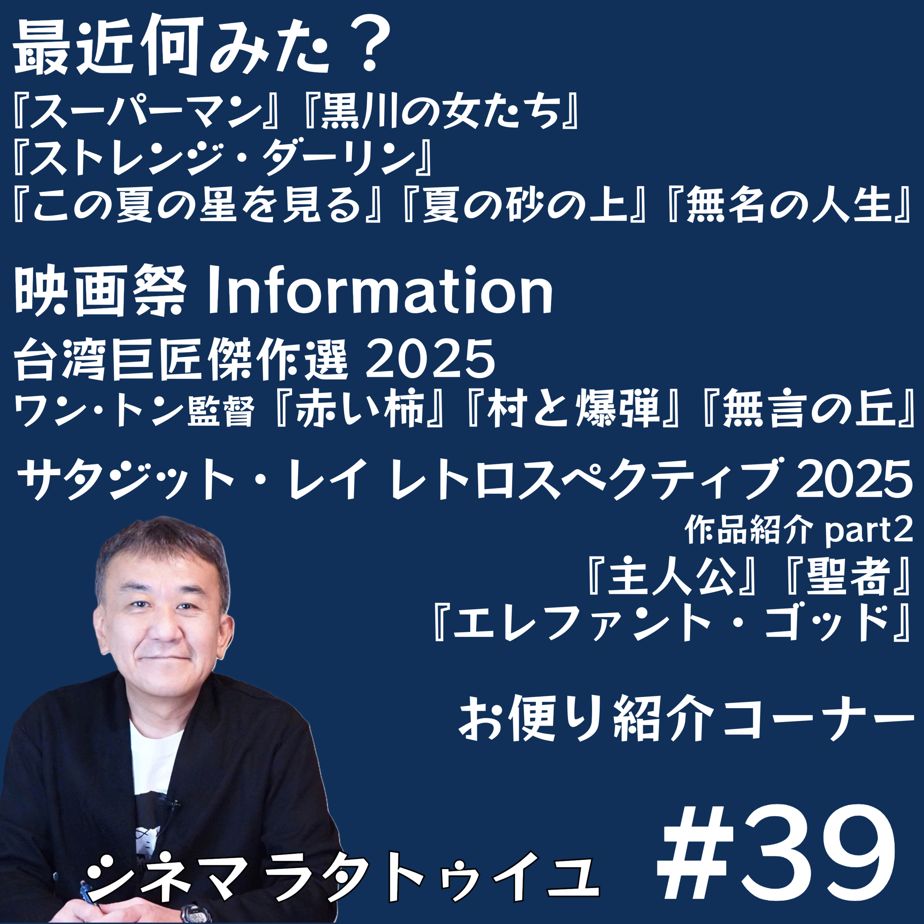 『スーパーマン』『黒川の女たち』『無名の人生』などを語り、台湾巨匠傑作選からワン・トン監督『赤い柿』『村と爆弾』『無言の丘』、サタジット・レイ監督特集から『主人公』『聖人』『エレファント・ゴッド』を紹介しています。「シネマの花嫁花婿」「初デート映画」関連メールも大募集しています!メールはこちらから!https://forms.gle/AixjXzRRYNSYPW5N8