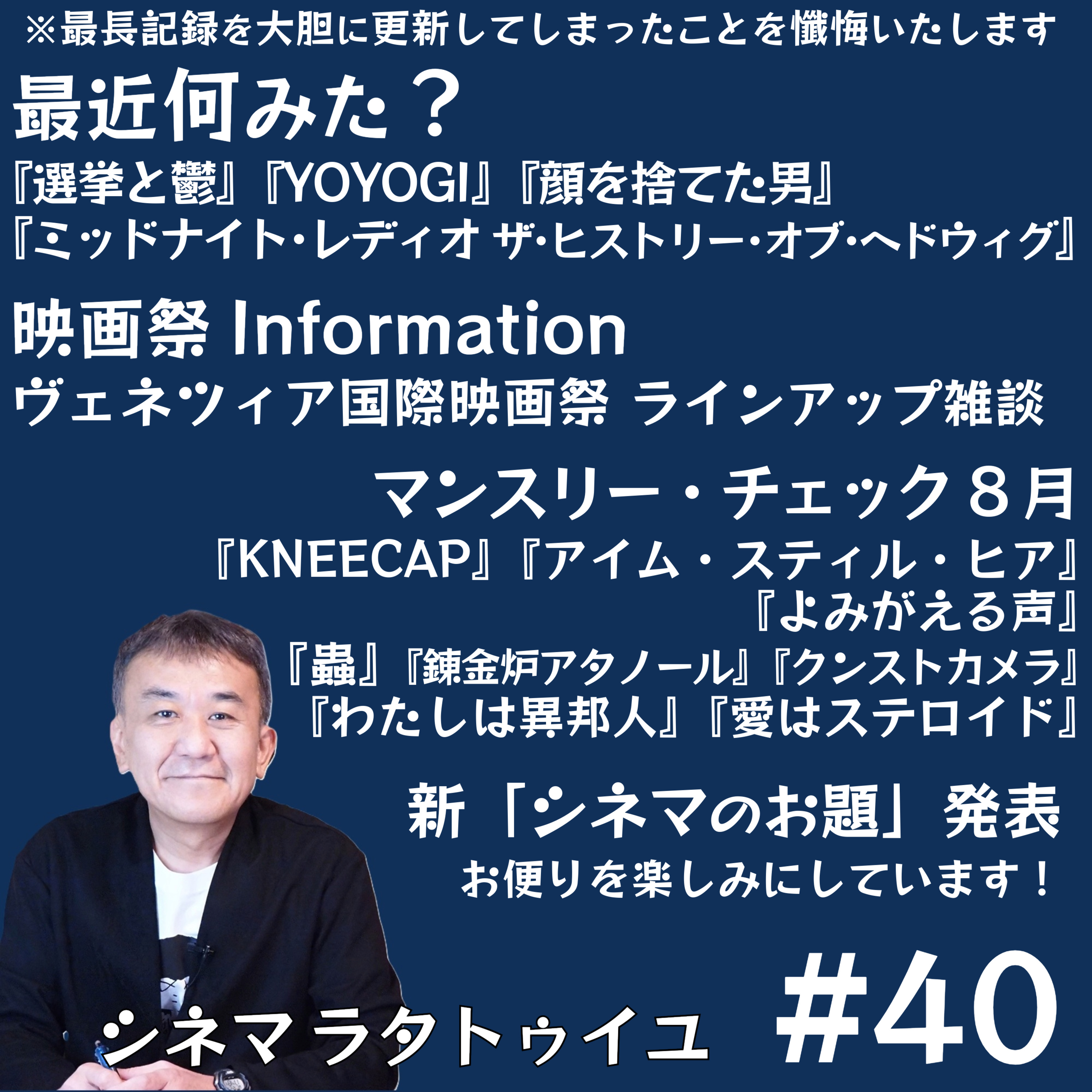 ベネチア映画祭のラインアップをたっぷり概観し、8月公開作品からヤン・シュワンクマイエル監督『蟲』『錬金炉アタノール』『クンストカメラ』や、『ニーキャップ』『よみがえる声』『わたしは異邦人』『愛はステロイド』を紹介しています。最近見た映画から『YOYOGI』『選挙と鬱』『顔を捨てた男』などにコメント。「シネマのお題」へのメールをお待ちしております!メールはこちらからお願いします。https://forms.gle/AixjXzRRYNSYPW5N8