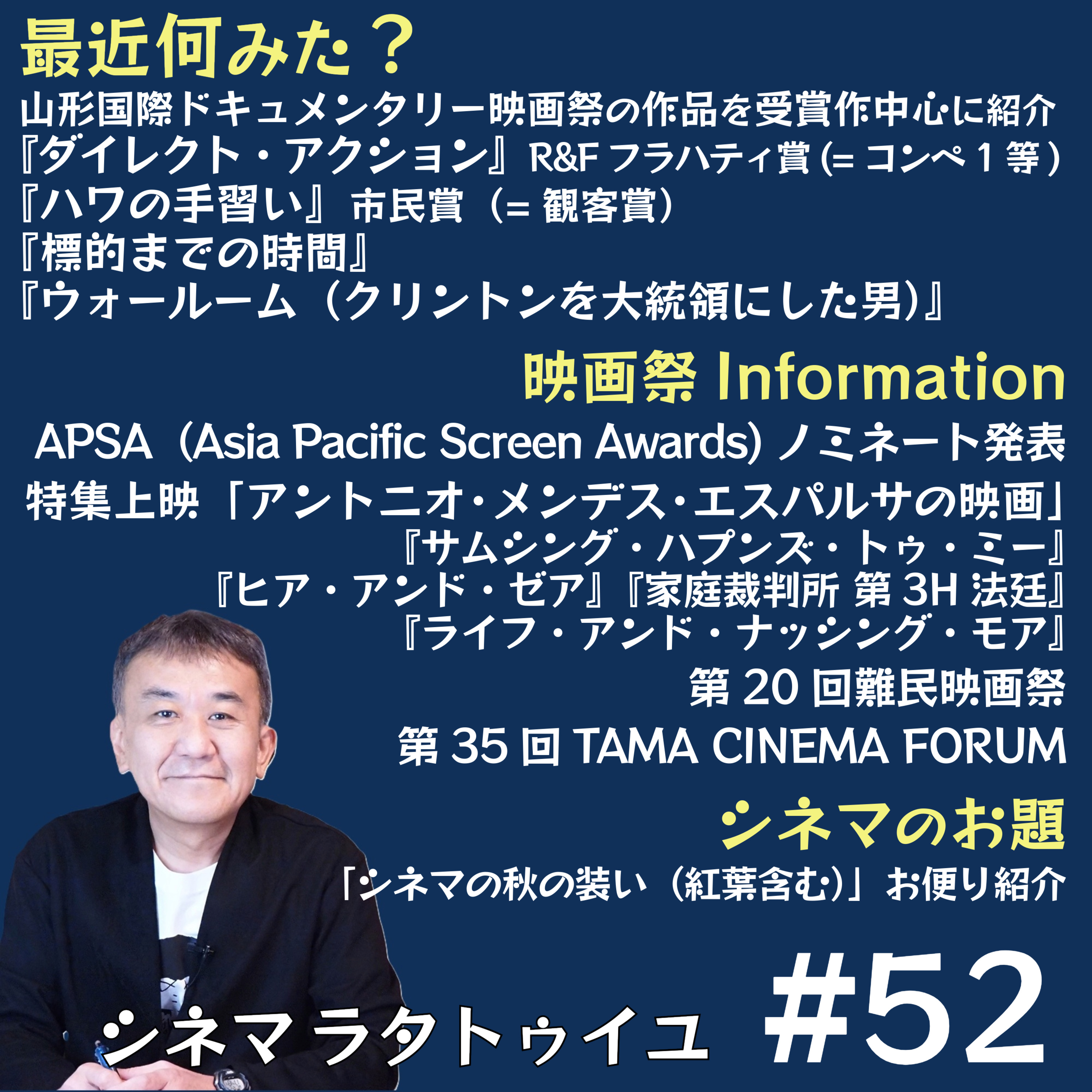 山形ドキュ映画祭の全体所感と『ダイレクト・アクション』や『標的への時間』等の見た作品を報告し、アントニオ・メンデス・エスパルサ監督新作『サムシング・ハプンズ・トゥ・ミー』と過去作特集で上映される『ヒア・アンド・ゼア』『ライフ・アンド・ナッシング・モア』『家庭裁判所 第3H法廷』を推し、難民映画祭に注目喚起する中で『バーバリアン狂騒曲』を勧め、「シネマの秋の装い(紅葉含む)」で珠玉のNY秋トーク。メールはこちらからお願い致します!https://forms.gle/AixjXzRRYNSYPW5N8