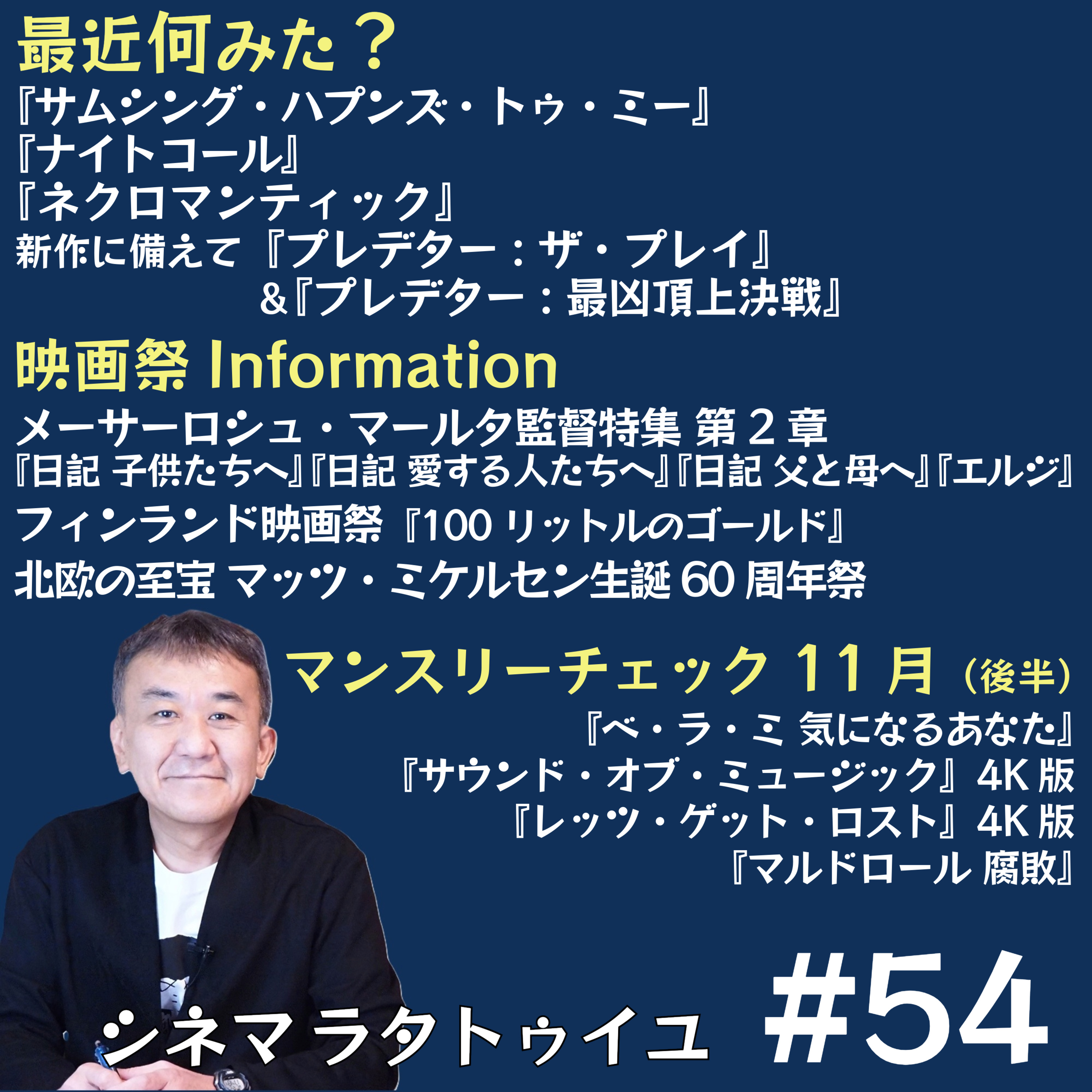 ハンガリーの名匠メーサーロシュ・マールタ監督特集の『日記』3連作と『エルジ』を紹介推薦し、11月後半公開作品チェックからは『ベ・ラ・ミ 気になるあなたに 』『マルドロール 腐敗』などを紹介、最近見た映画から『ナイトコール』を強く推し、フィンランド映画祭やマッツ・ミケルセン特集にも言及しつつ、プレデターのシリーズについて要チェックかもしれない点についてもしゃべっています。メールはこちらからお願いします!