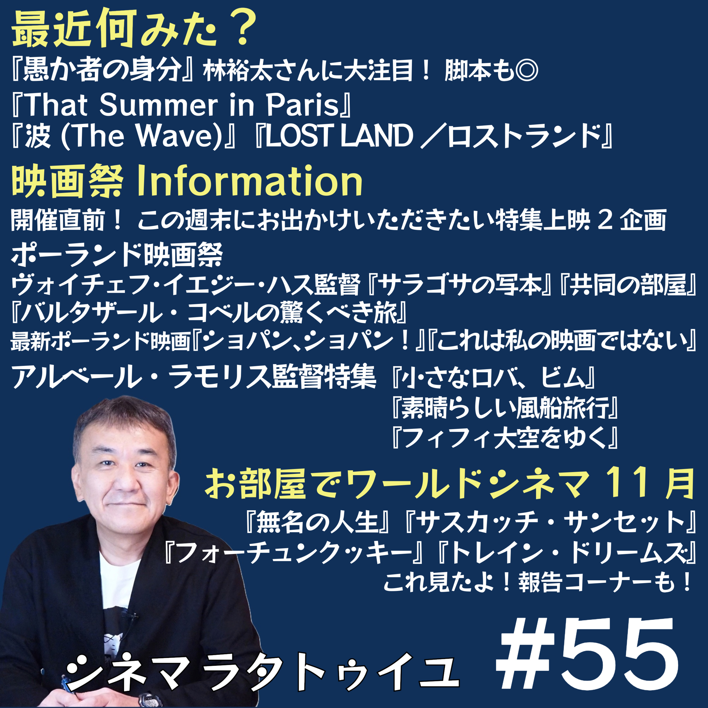 「ポーランド映画祭」の新作から『ショパン、ショパン!』『これは私の映画ではない』『ディプロドクス ~恐竜とボク』を紹介し、同映画祭内のヴォイチェフ・ハス監督特集から『サラゴサの写本』『共同の部屋』『バルタザール・コベルの驚くべき旅』を強く推薦紹介し、アルベール・ラモリス監督特集から『素晴らしい風船旅行』『小さなロバ、ビム』『フィフィ 大空をゆく』も熱く語り、11月配信入り作品もチェックし、最近見た映画としては『愚か者の身分』や『波』にも言及しています!メールはこちらかお願いします!https://forms.gle/AixjXzRRYNSYPW5N8