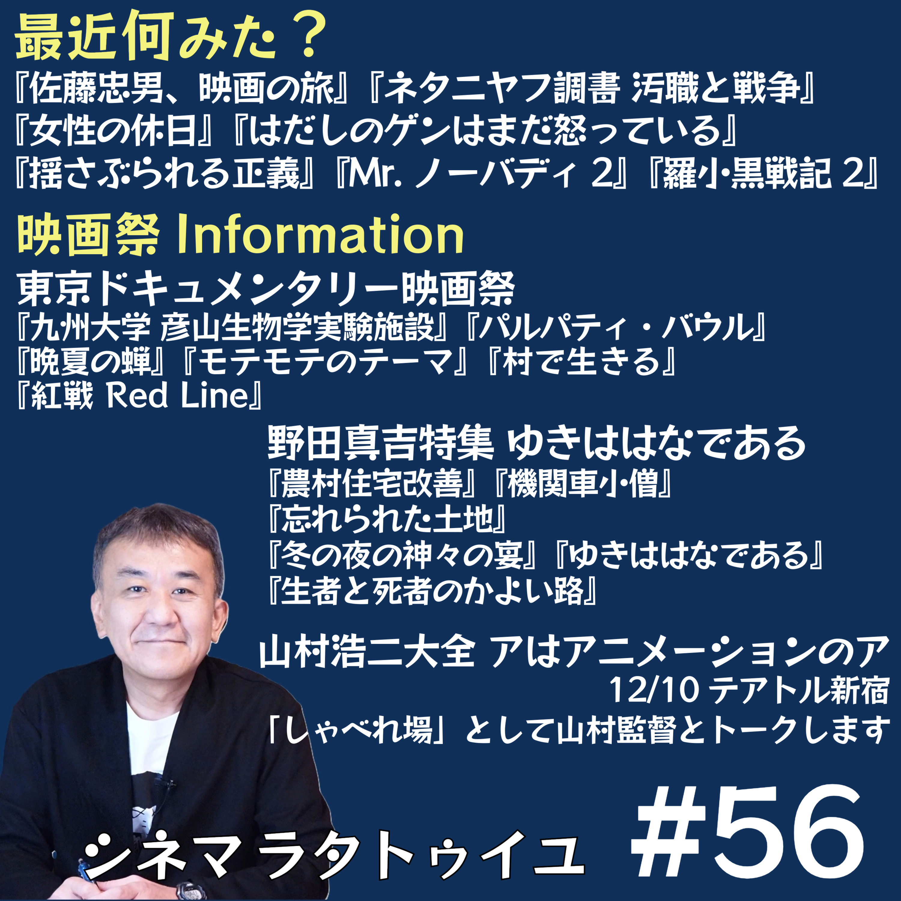 ドキュたっぷりの回!最近見た作品として『佐藤忠男、映画の旅』『ネタニヤフ調書』『女性の休日』『はだしのゲンはまだ怒っている』『ハルツーム』等を語り、「東京ドキュメンタリー映画祭」からコンペ作品をいくつか紹介推薦し、「野田真吉監督特集」を熱を込めて紹介しています。さらに11月期待の作品として『医の倫理と戦争』にも言及しています。メールはこちらからお願いします!https://forms.gle/AixjXzRRYNSYPW5N8