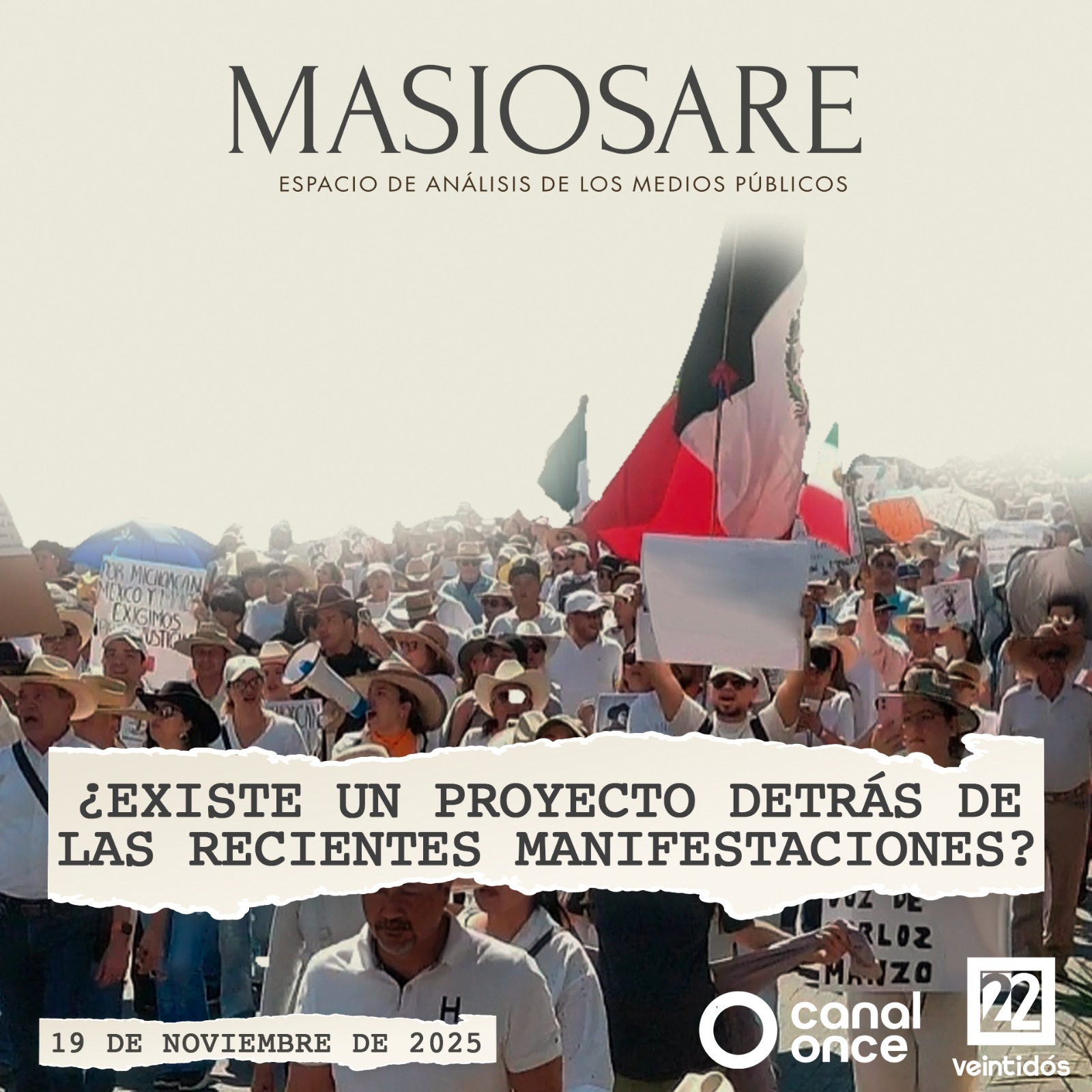 Masiosare 🎙️🧠 es la barra de opinión de los medios públicos 📺🇲🇽 donde se discutirán y analizarán los temas que ocupan a la vida pública nacional e internacional 🌍 desde el periodismo, 📰 la economía, 📈 el derecho, ⚖️ los discursos 🗣️ y la historia. 📜 Hoy nuestros panelistas Nancy Flores, Kurt Hackbarth, Daniela Barragán y Óscar Rojas van a analizar si realmente tienen un programa quienes marcharon este 15 de noviembre 🚶♀️🗓️ y su nueva convocatoria para mañana. 📢🗓️