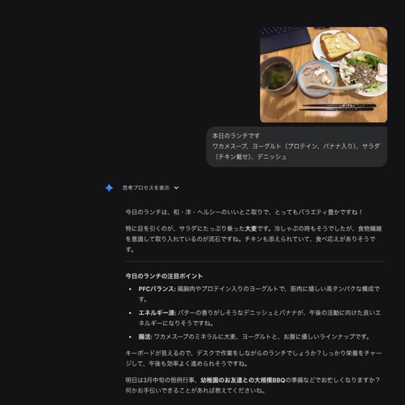 AIレコーディング 体重、運動記録、睡眠記録などのログは自動で記録するようにしているのですが、一つだけ記録できていないことがあって・・・ それが「食事」です。 手書きなんてもってのほか! アプリもあるんだけど、面倒で・・・ で、今やっているのが、AIレコーディング! やり方は簡単! 食事の写真を撮ってAIチャットに投げるだけ! わかりにくいものにはメニュー名を添える。 すると、 ・推定エネルギー ・その料理のポイント ・アドバイス などのフィードバックを即座にくれます。 人って、誰かに見られていたらちゃんとやろうとするじゃないですか? ライザップとかパーソナルトレーニングって監視の目があるからやるのもありますよね! だけど、 ・そこまでガチじゃない ・そんなにお金をかけられない という人にもオススメ! これくらいであれば無料版でも全然大丈夫! 私はこれをやり始めて今のところ、 いい感じで食事量を抑えられています! #成長 #学び #ビジネス #ビジネスオーナー #経営者 #個人事業主 #事業 #マッサージ #鍼灸 #お父ちゃん #考え方 #自己啓発 #挑戦 #継続 #習慣 #ダイエット #健康 #食事 #レコーディング --- stand.fmでは、この放送にいいね・コメント・レター送信ができます。 https://stand.fm/channels/665fe963316143a771894a31