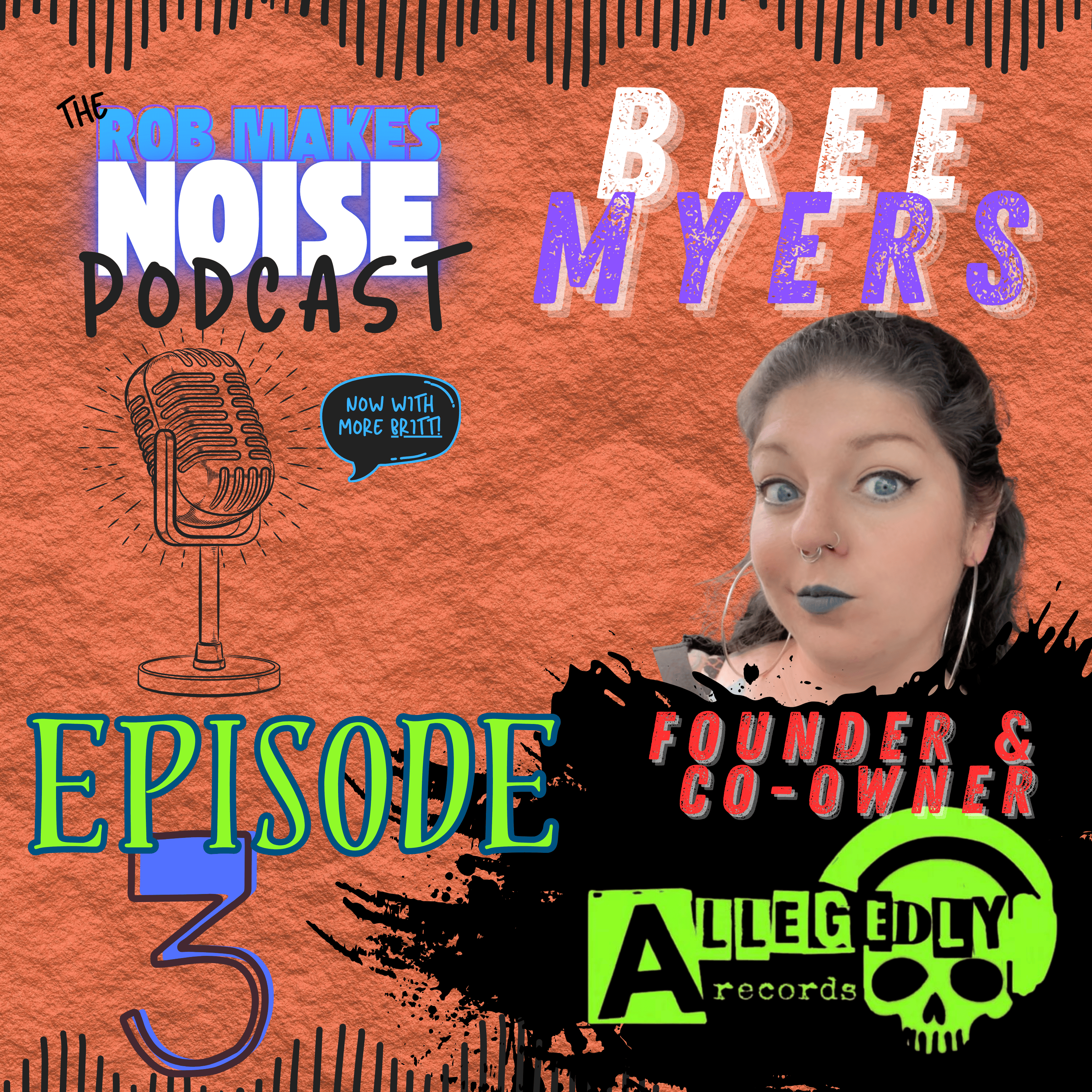 On the long-awaited Episode 3 of the RobMakesNoise Podcast (now w/ more Britt), Rob and Britt talk with the smart and outspoken Bree Myers. Bree is the Founder and Co-Owner of Indy Rock/Punk Label Allegedly Records, a powerhouse collection of killer talent based on both the East and West Coasts. Bree talks about some of the incredible bands her label represents, plays Halloween Trivia against Britt and she shares some of her vast knowledge of rocks and fossils.