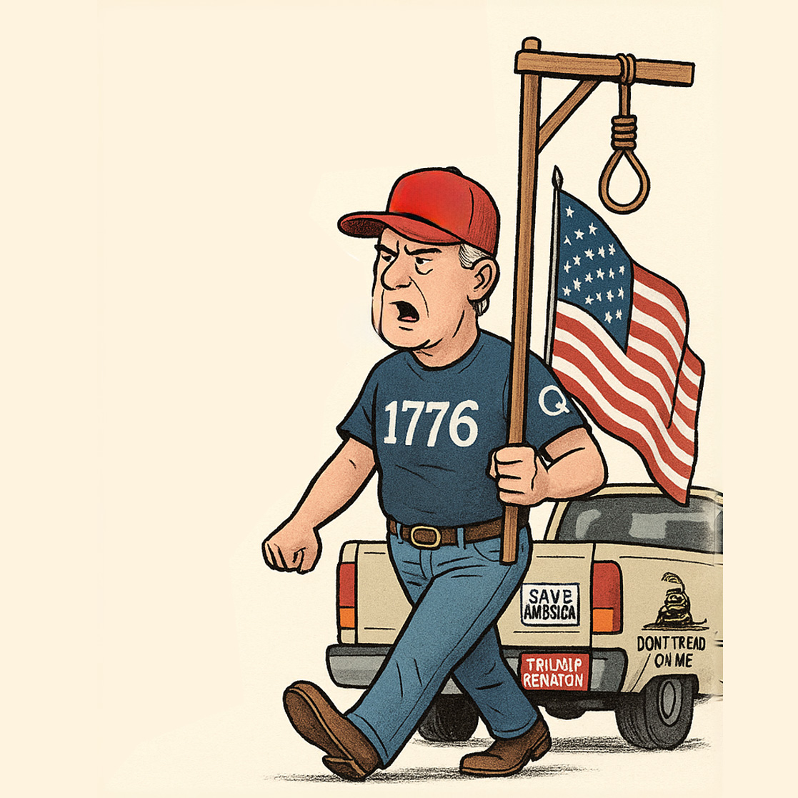 With “1776” inked across my chest, I swear the libs are the real threat, Bought six more guns for liberty's sake— (But forgot my insulin by mistake.)