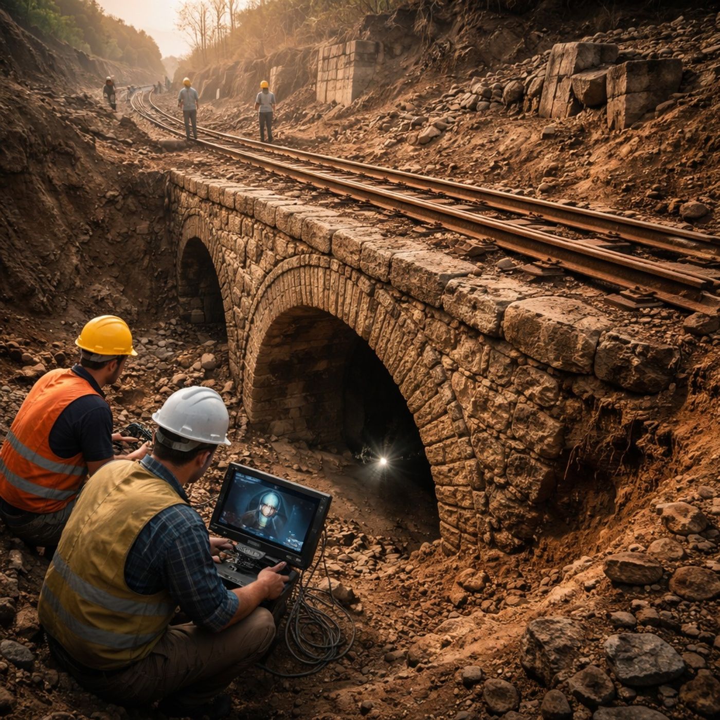 يركز النص على اكتشاف كوبري سكة حديد تاريخي يُعتبر من أقدم المنشآت من نوعه، وكان مدفونًا بالكامل تحت طبقات ضخمة من مخلفات المناجم منذ أكثر من 200 عام. شكّل موقعه العميق تحديًا كبيرًا، لذلك استخدم الباحثون تقنيات حديثة مثل أجهزة المسح والرادار لتحديد مكانه بدقة قبل بدء الحفر.