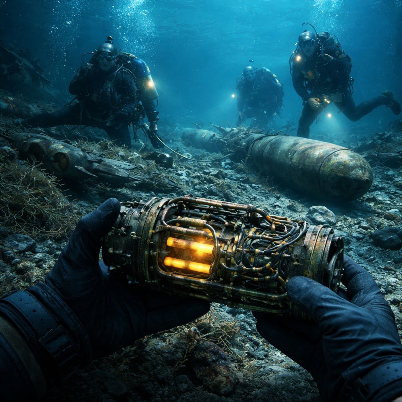 يركز النص على مهمة خطيرة لفريق غوص بحث عن بقايا مكونات القنابل الذرية المفقودة قرب جزيرة تينيان في المحيط الهادي، وهي الجزيرة اللي كانت نقطة الانطلاق للهجمات النووية على اليابان خلال الحرب العالمية الثانية. بعد انتهاء الحرب، تم التخلص من بعض المكونات الحساسة في البحر لإخفائها ومنع استخدامها مرة تانية.