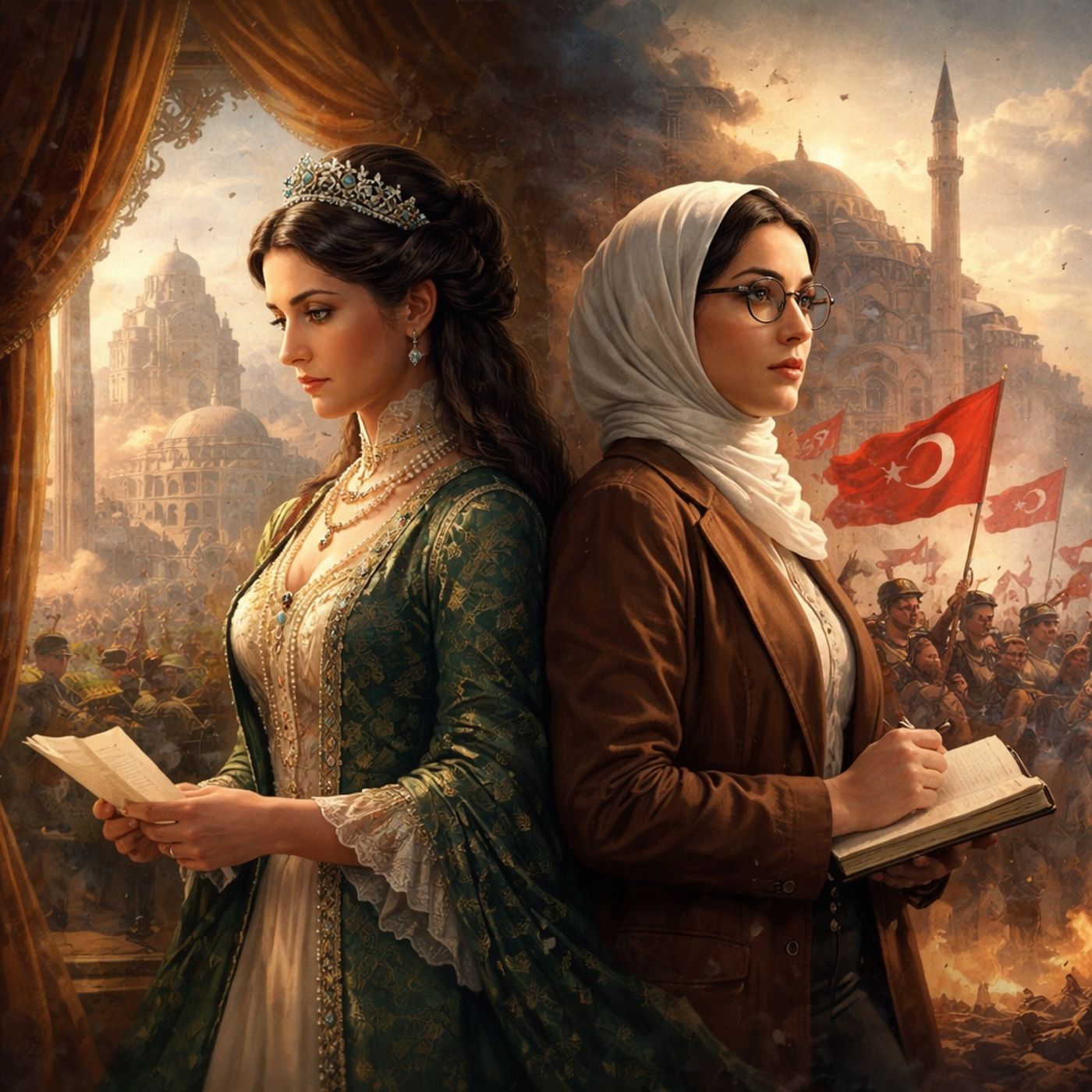 الأميرة خديجة: عاشت تحت قيود الحريم والزواج المدبّر، وتعرضت لفضيحة هزت العائلة المالكة، وانتهى بها المطاف في المنفى.خالدة أديب: مثال للمرأة المتحررة والمثقفة، شاركت في بناء الدولة الحديثة وكانت صوتاً للمقاومة النسائية والوطنية.القصة تبرز التباين بين حياة العزلة والتبعية داخل القصور وحياة النضال والتحرر، وتسلط الضوء على سقوط السلطان عبد الحميد الثاني وتحول المجتمع التركي من الخلافة إلى الجمهورية العلمانية. في النهاية، توضح المفارقة التاريخية في أن كلتاهما واجهتا الغربة والمنفى رغم اختلاف أدوارهما في التاريخ التركي.