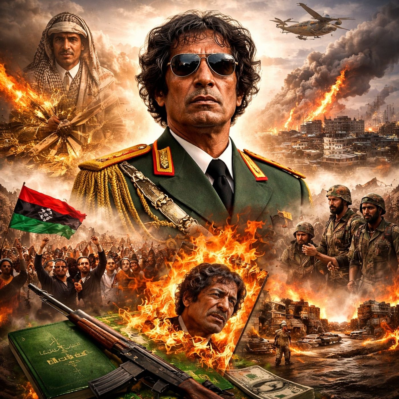 تلخص القصة مسيرة معمر القذافي منذ نشأته في بيئة بدوية فقيرة، وصولًا إلى استيلائه على الحكم عبر انقلاب عسكري عام 1969 أطاح بالملك إدريس. يستعرض النص محاولته فرض رؤيته السياسية والاجتماعية الخاصة، خاصة من خلال الكتاب الأخضر، إلى جانب فترات طويلة من القمع والصدام مع الداخل الليبي والقوى الغربية، ما أدى إلى عقوبات دولية وعزلة سياسية. يبرز السرد التناقض بين خطابه عن القومية العربية وممارساته السلطوية التي ساهمت في تدهور الاقتصاد وتقييد الحياة السياسية. كما يتناول أحداث الثورة الليبية عام 2011 وتدخل حلف الناتو، التي انتهت بسقوط النظام ومقتل القذافي في سرت. ويختتم النص بطرح إرثه كشخصية جدلية، بين من يراه زعيمًا ثوريًا ومن يعتبره طاغية ترك البلاد في فراغ سياسي وفوضى.