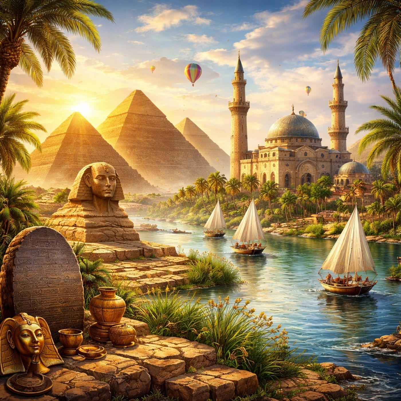 تلخص المصادر رحلة تاريخ مصر الطويلة وعلاقة شعبها الوثيقة بنهر النيل، الذي كان شريان الحياة منذ عصر الفراعنة حتى العصر الحديث. يسلط النص الضوء على الاكتشافات الأثرية الكبرى مثل حجر رشيد الذي فك رموز الهيروغليفية، وأسرار بناء الأهرامات وعمليات التحنيط المرتبطة بمفهوم الخلود. كما يوضح تطور الثقافة المصرية وتداخلها بين العادات الفرعونية، القبطية، والإسلامية، وتأثير ذلك على الفن، العمارة، واللغة. يأخذنا السرد من أودية الصعيد والواحات النائية إلى القاهرة والإسكندرية، موضحًا كيف طوّع المصريون البيئة الصحراوية الصعبة. وتخلص المصادر إلى أن مصر الحديثة استمرار حي لحضارة قديمة ما زالت تدهش العالم بالاكتشافات المتجددة.