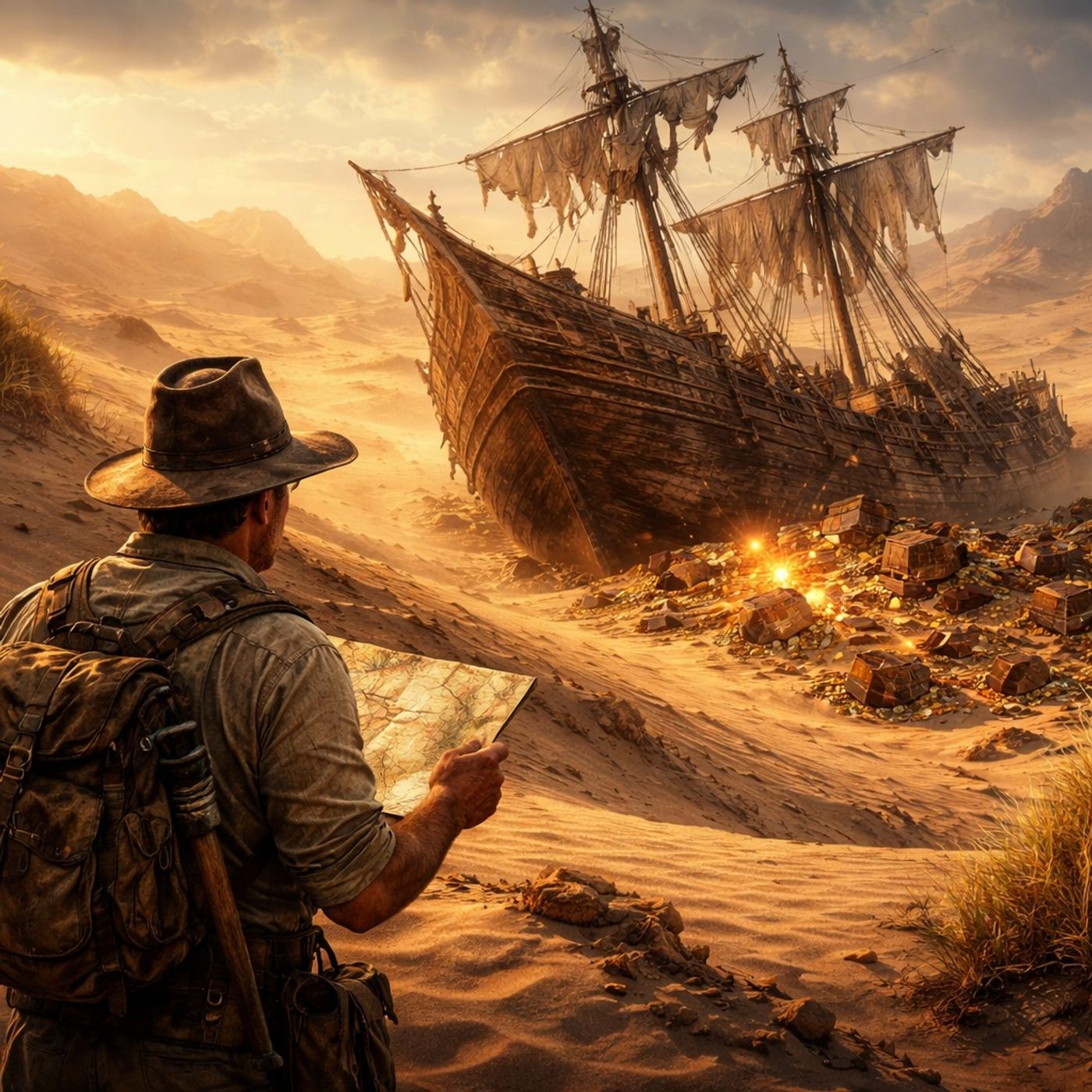 النص بيحكي عن أسطورة سفينة مفقودة مليانة كنوز وسط رمال صحراء "موجافي" في كاليفورنيا: