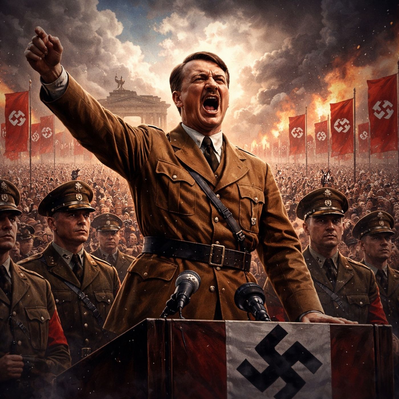 يعرض النص كيف تمكن أدولف هتلر من تحويل ألمانيا إلى مجتمع متطرف عبر خطب حماسية ووعود زائفة بالأمن الاقتصادي واستعادة الكرامة الوطنية. يتتبع صعوده من جندي مغمور إلى منصب الفورر، مستغلًا أزمات مثل اتفاقية فرساي والانهيار الاقتصادي لبناء نظام قائم على العنصرية والكراهية. يوضح السرد اعتماده على دائرة مقربة مثل جوبلز وهملر لفرض السيطرة بالبروباغندا والترهيب. كما يكشف عن الأفكار التوسعية والإبادية التي صاغها في كفاحي تحت غطاء القانون والنظام. وينتهي بشرح كيف قادت هذه السياسات إلى كارثة الحرب العالمية الثانية بعد خداع الشعب بادعاء السلم.