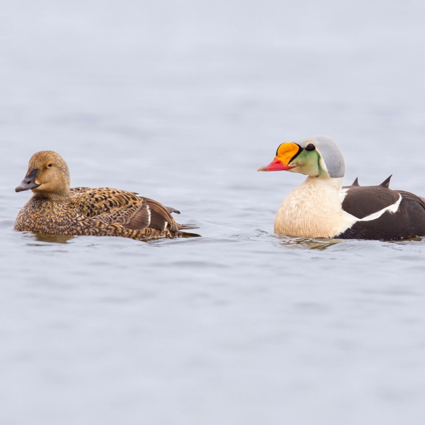 The King Eider is one of the most striking sea ducks in the Northern hemisphere. This male King Eider is trying to woo a mate with soft coos and brilliant colors — his beak and feathers are decked out in black, white, green, grey, tangerine, yellow, and ivory. Unlike her showy suitor, the female King Eider is mottled brown — the perfect camouflage for blending into the Arctic tundra. After incubating her nest for nearly 3 weeks by herself, the female eider leads her fluffy chicks to the sea where the ducks spend the winter diving amidst the pack ice in search of t...